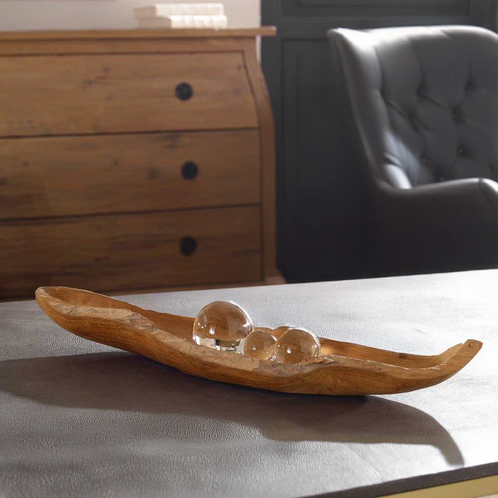 A low, rectangular wooden tray is placed beside the book, providing a natural and warm contrast to the glass surface. The tray helps organize and display the curated objects in a neat and elegant manner.