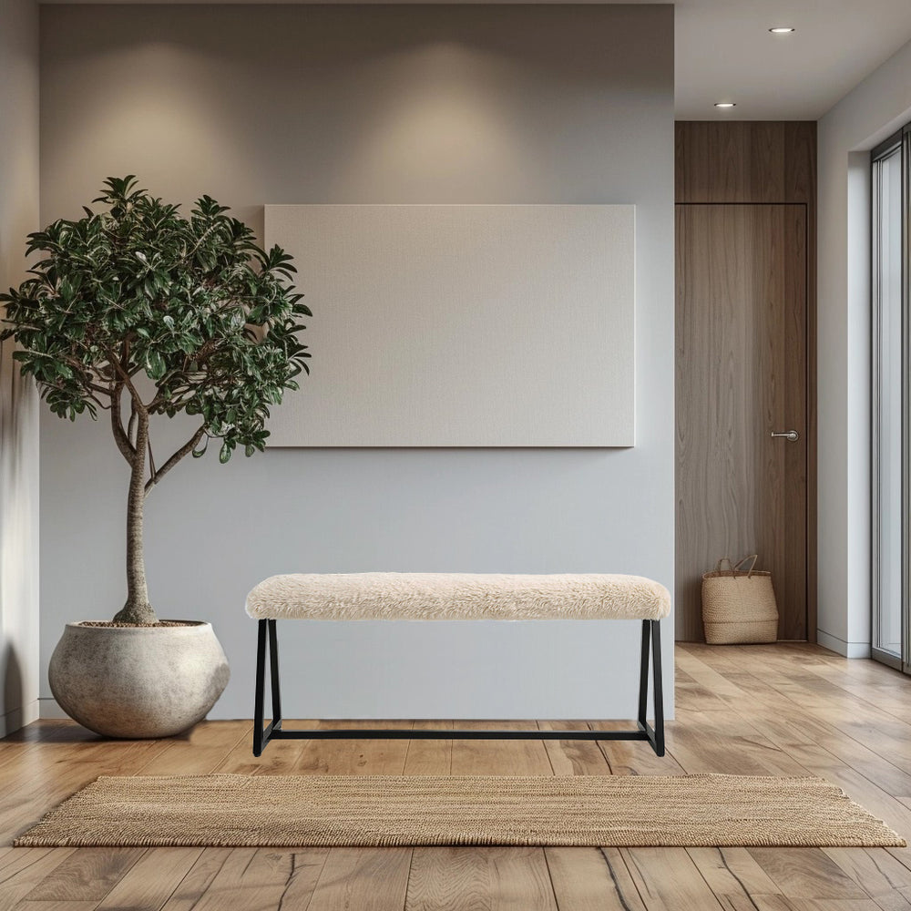 The modern farmhouse look on the right leans more into warmth and texture. Start with the same whitewashed bench, then layer it over a richly textured rug in deep earth tones to ground the space. Add wall art or posters in clean frames for a touch of contemporary personality. Keep tabletop decor minimal but impactful—like a rolled magazine or a sleek tray with small plants or candles.