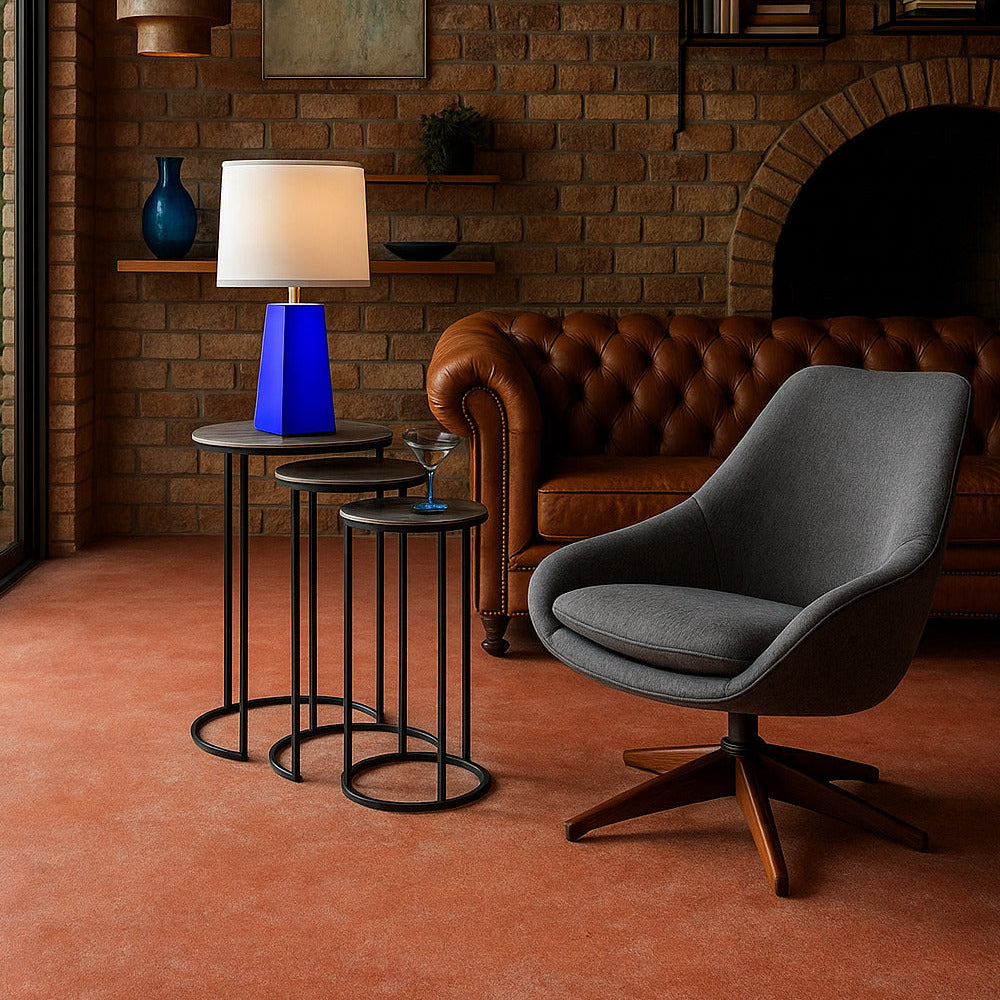 This electric cobalt lamp punctuates the space with modern energy. Its geometric base and clean white shade feel almost sculptural against the brick wall. It’s perfect for adding contrast in a room full of earth tones. Designers use pieces like this to surprise the eye and break up tonal palettes. It's ideal in reading corners or entry consoles where a jolt of color is welcome.