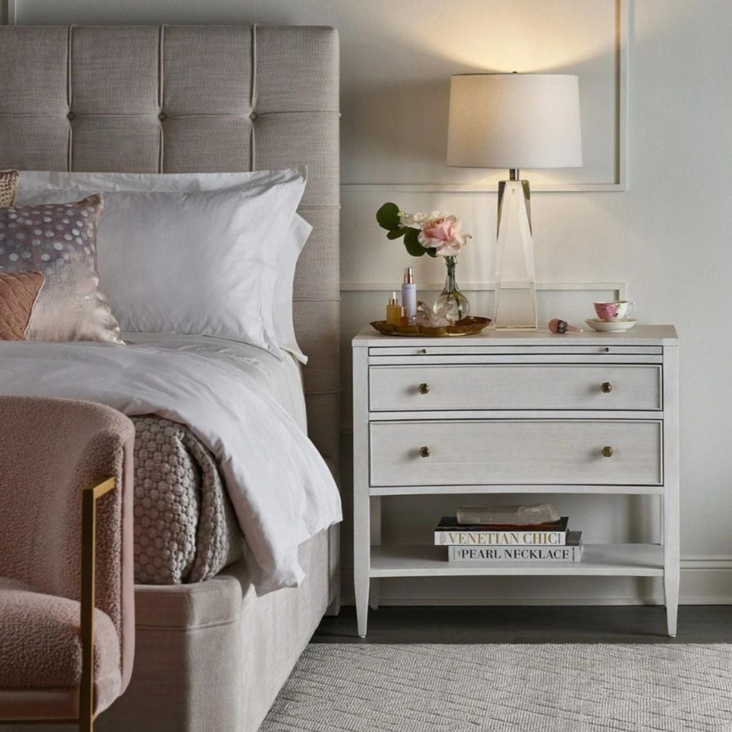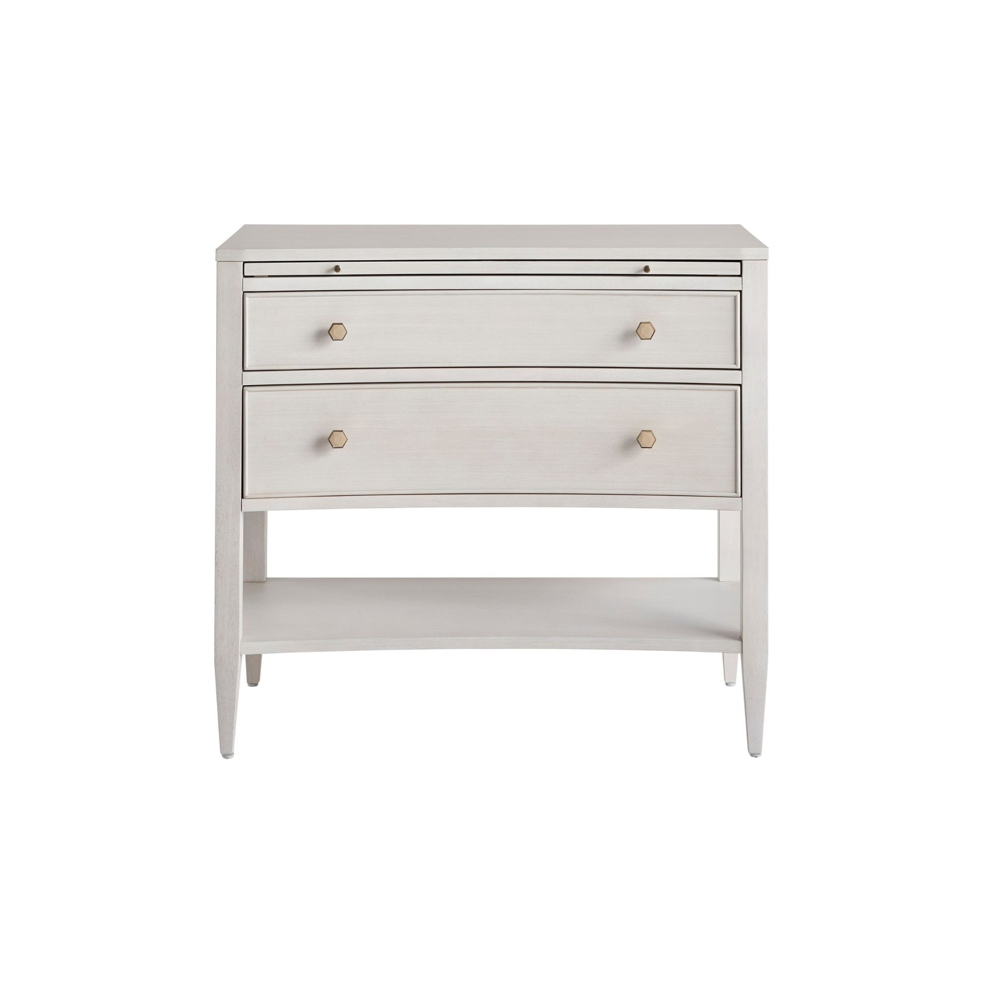 Wonderfully chic and sophisticated, this Nightstand is encased in an Alabaster finish and designed with two drawers, and a laminated pull-out shelf. It is accented with soft gold, hexagonal hardware for a simple, streamlined look.