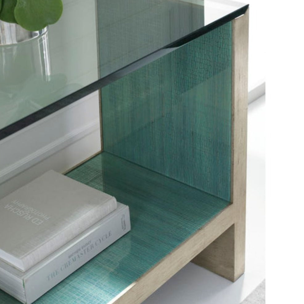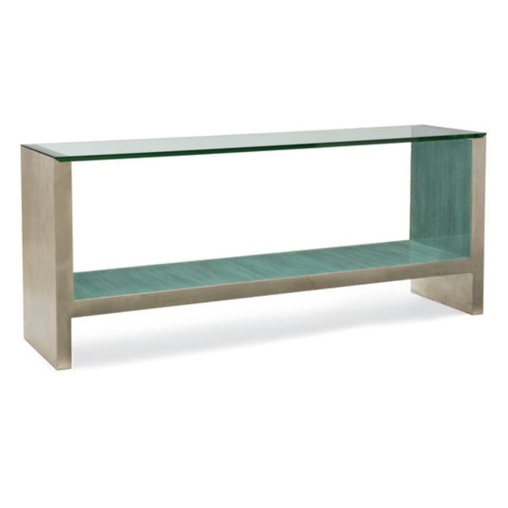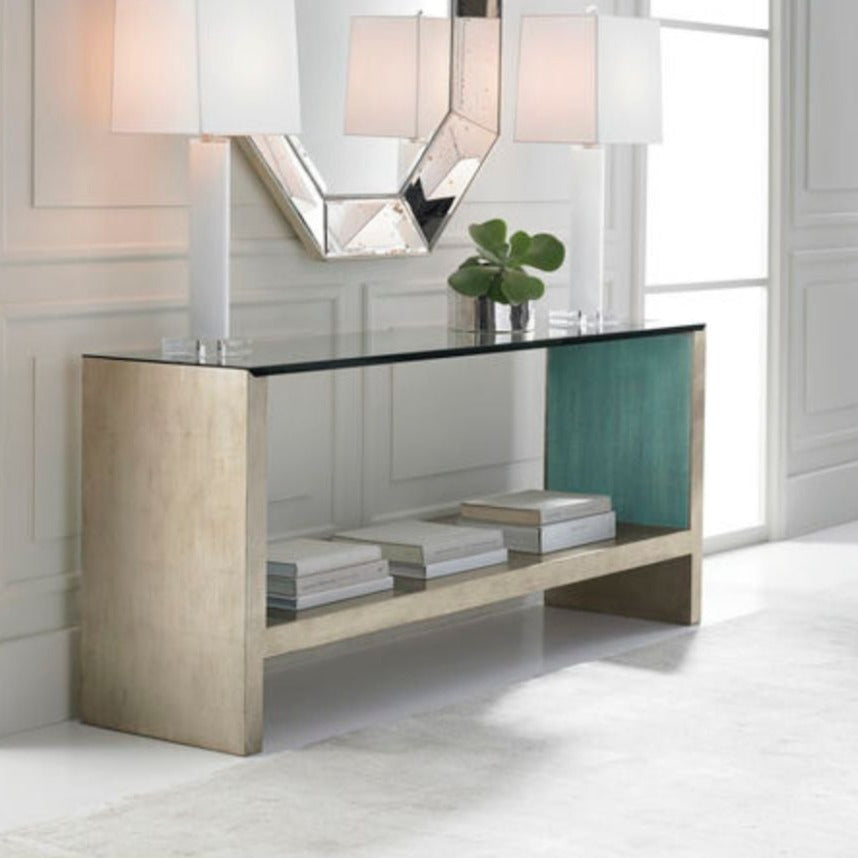 Our lengthy console features a glass top which is set in a sleek open frame that is finished on the outside in Coastal Silver Leaf. The interior and tray shelf are lined with turquoise green and crackled gold glass for an impressive display. This piece makes a spectacular statement in any foyer, behind a sectional or as a serving piece for parties.