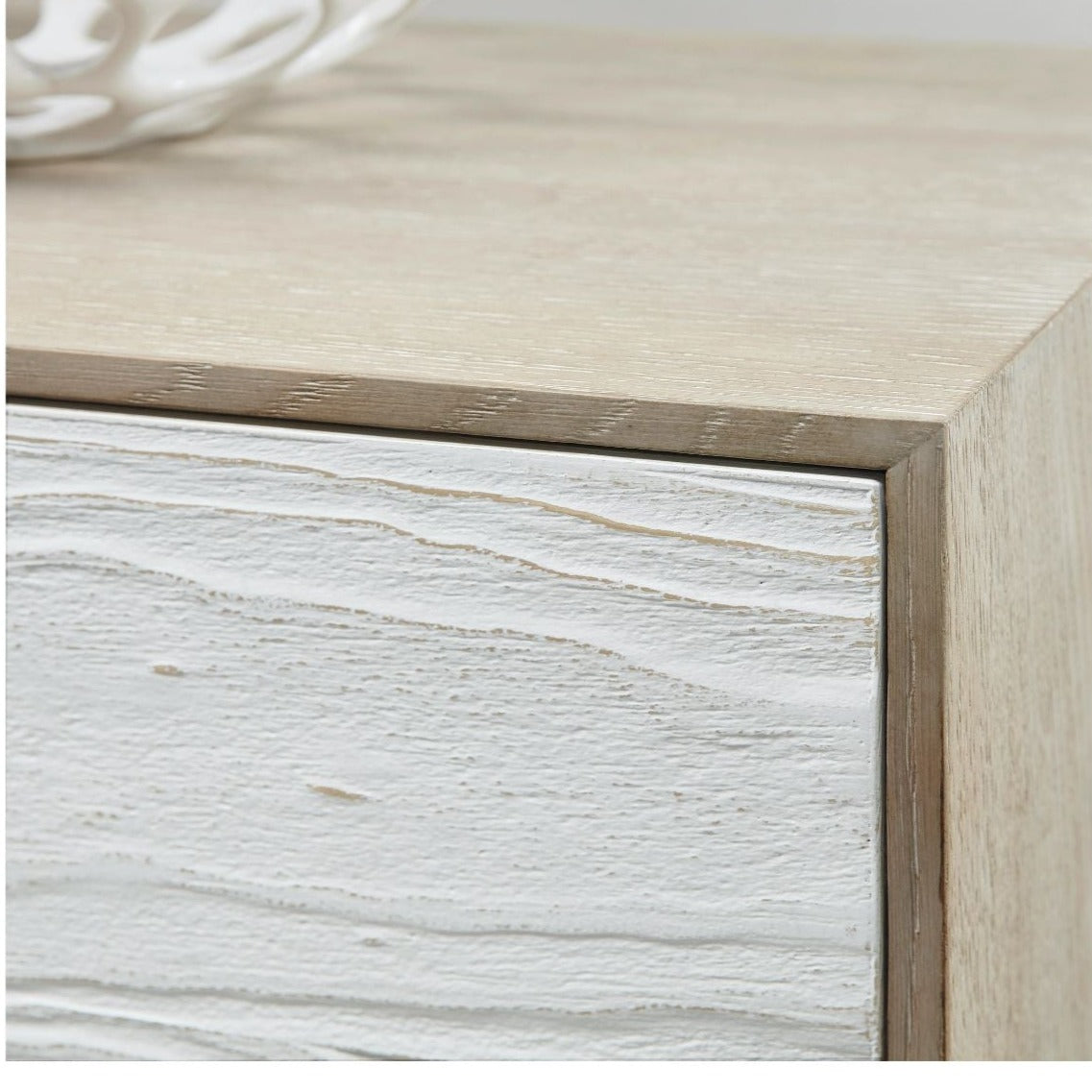 Couture and chic, the Console combines a slender and graceful silhouette with a two-tone finish in a serene color palette of whites, creams and taupe. The outside of the case is crafted of Oak Veneers in the soft taupe Terrain finish with dry brushing, while the door and drawer fronts are in a chalk-colored cast resin, accented by champagne-colored bar pull hardware and a metal base.