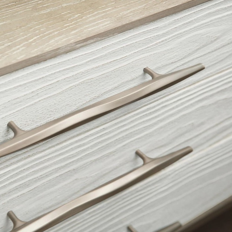 Finish: Outside of case: Terrain: a soft, taupe finish on oak veneers. Distressing includes dry brushing. Drawer and door fronts: Chalk: cast resin in a soft, white finish. Champagne colored bar pull hardware and metal base.