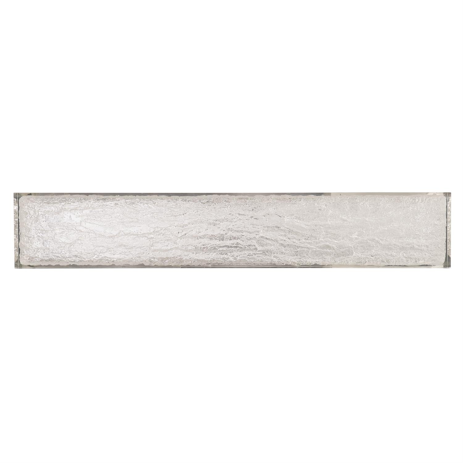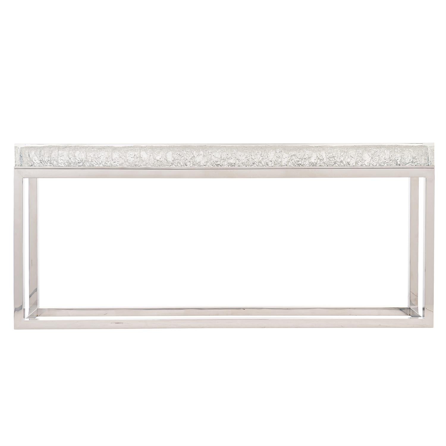 This console table features a unique pairing of materials with an irresistible allure. Crafted from solid acrylic with a cast wood grain pattern, the table top resembles a glistening block of ice.