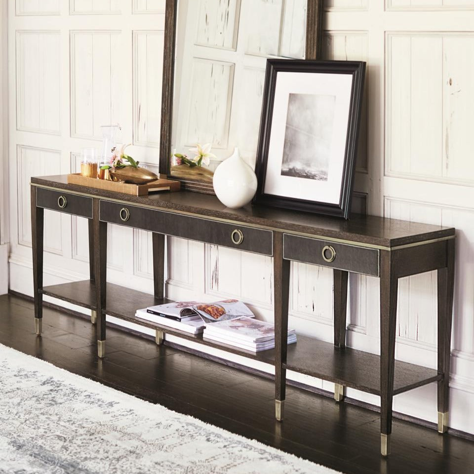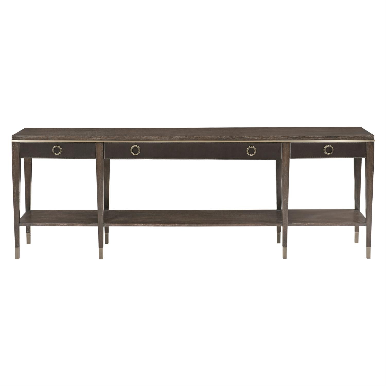 Wire-brushed white oak veneers are presented in a dark brown Arabica finish with a cerused effect complemented by additional spattering and cowtailing. With its cool undertones, the Burnished Brass finish on the ring pulls pairs effortlessly with Vienna Walnut top-stitched bonded leather on the three drawers. Contemporary design details like metal bead molding and ferrules add another layer of sophistication to this fashionable piece.