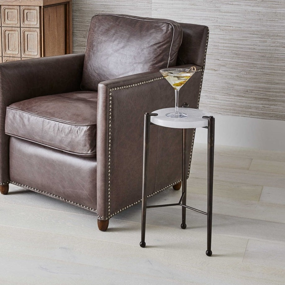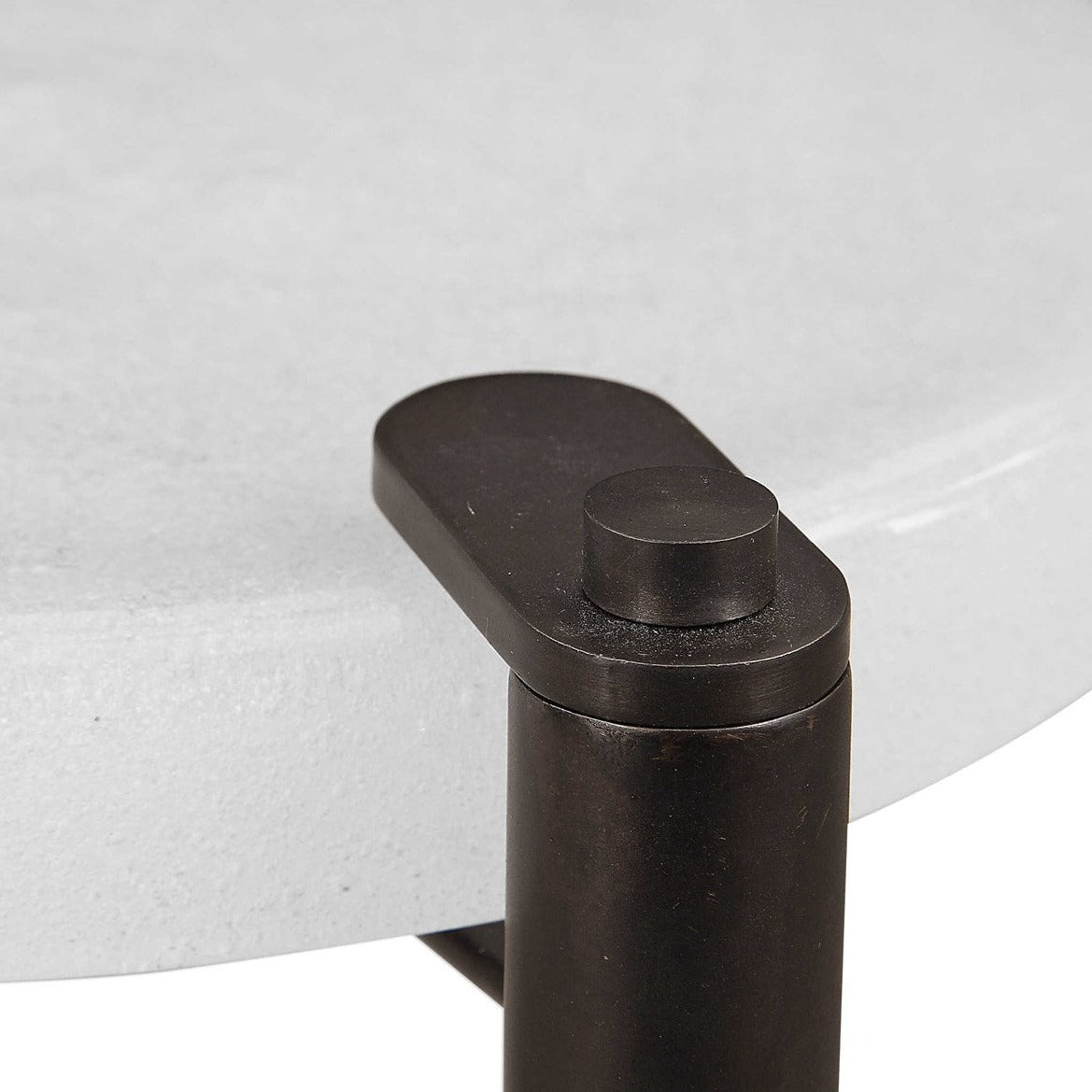 Thick hand polished art glass in a heavily seeded cloud white, suspended by an industrial inspired iron base with tapered legs accented by ball feet, finished in an acid oxidized dark bronze.