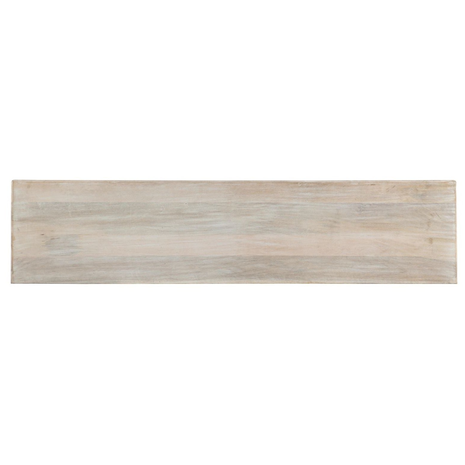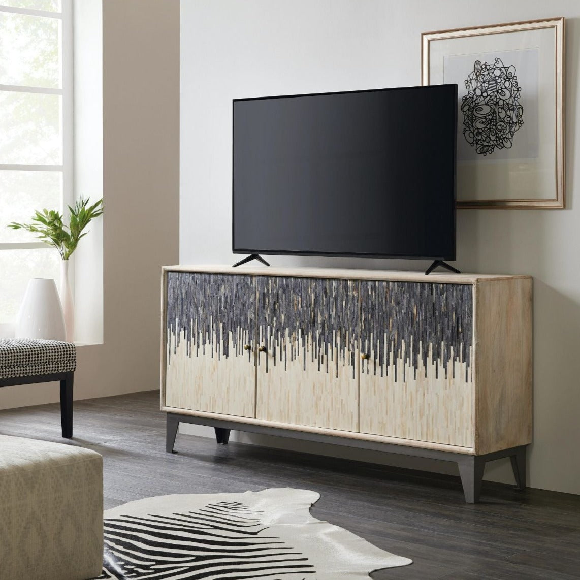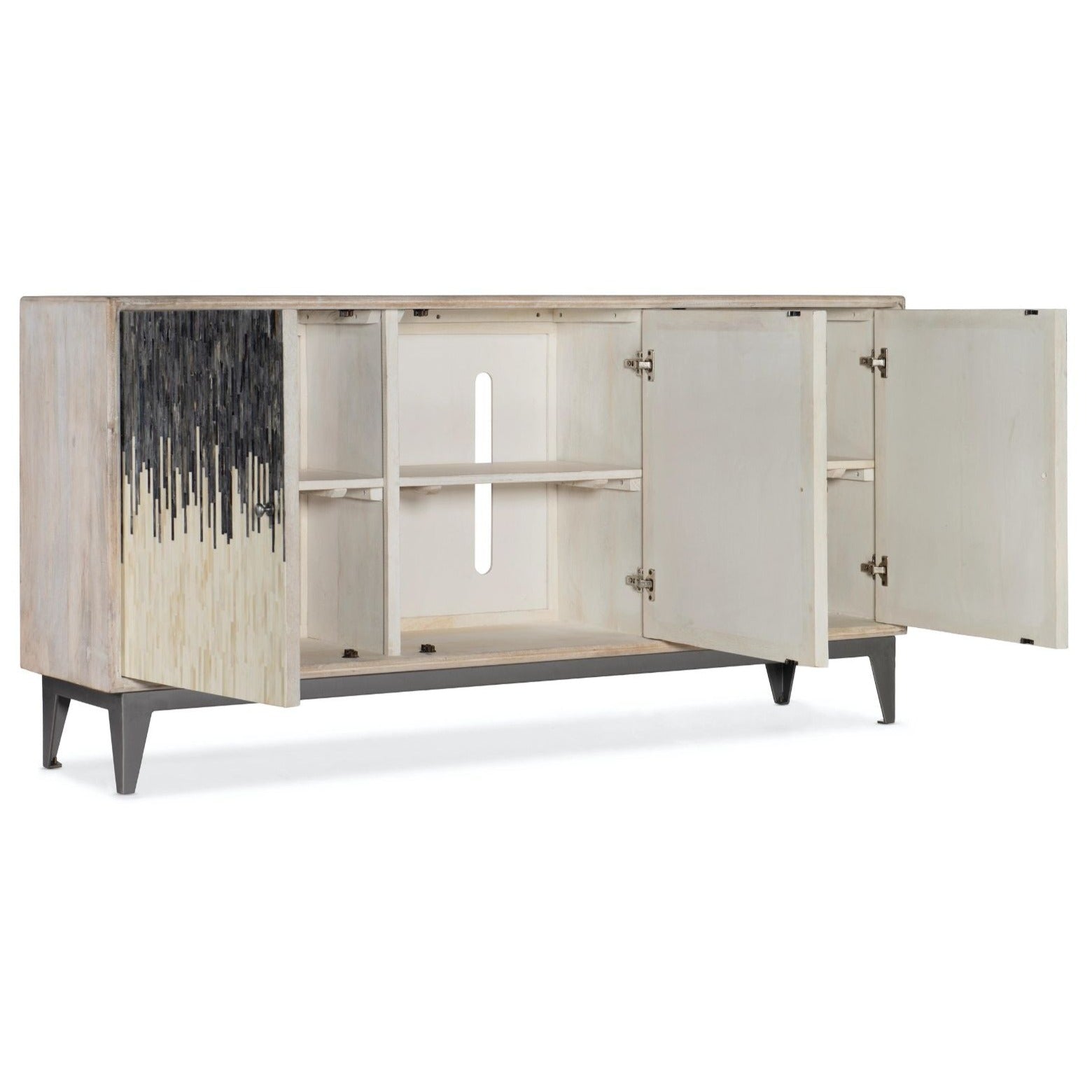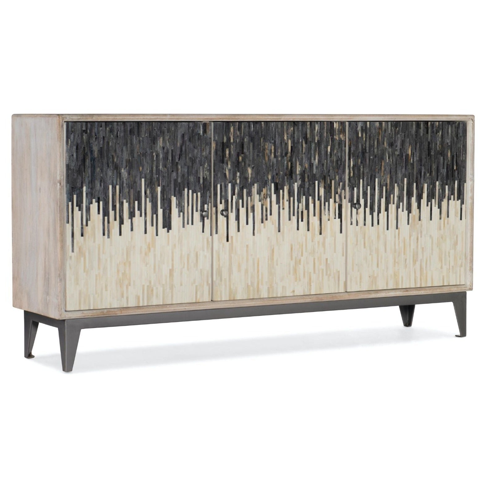 With a modern art vibe, this Three-Door Console is crafted of Mango Wood with contrasting gray and bone door fronts. The outside of the case is in a rustic light finish, accented by matte zinc metal knobs and iron base. There’s one removable shelf behind each door and a ventilated back panel. Accommodates up to a 70-inch TV. Gracefully disguise modern technology with our entertainment centers and TV consoles.