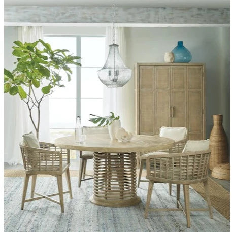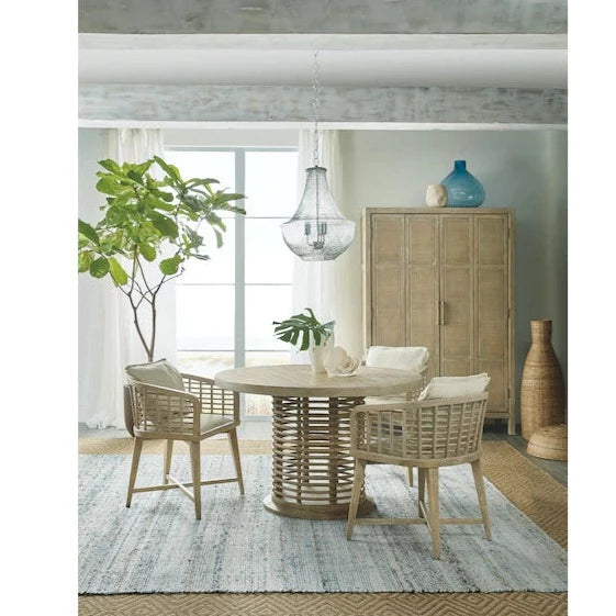 The legs, arms and X-style stretcher are finished in the light natural Driftwood finish with distressing including sandblasting and bleaching. Melding the salty, yet cozy oasis of the California coastline with a modern surf culture, defined by the use of natural materials including rattan, jute rope, stone, gypsum, bamboo and driftwood motifs. Designed to create relaxing spaces to escape from the pressures of modern life, it is featured in a light, natural Driftwood finish. Luxurious materials, shapes and textures combine to create a relaxed, yet sophisticated style that epitomize the lifestyle of a casual, beach-town community.