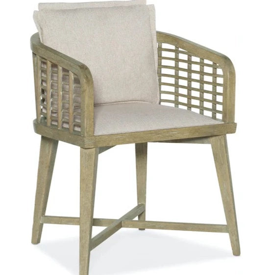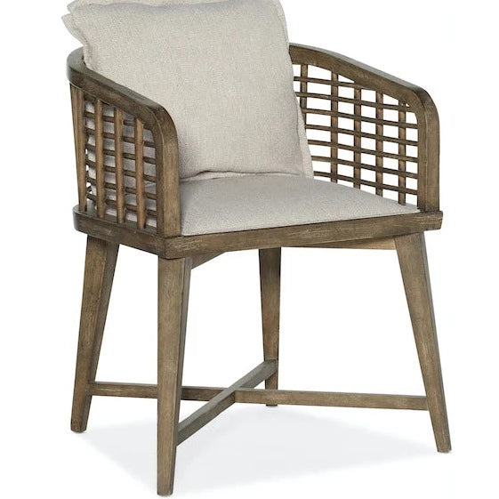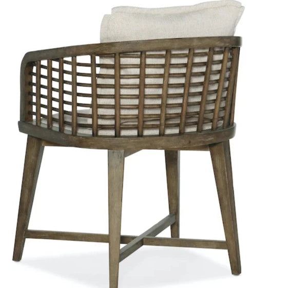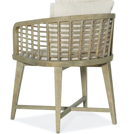 Create a calming resort-inspired retreat in your home with the laid-back Sundance Barrel Back Chair. The appealing lattice design of the cane seat back combines with a loose back pillow and an upholstered seat covered in the Zuri Cream performance fabric to invite you to linger and relax.