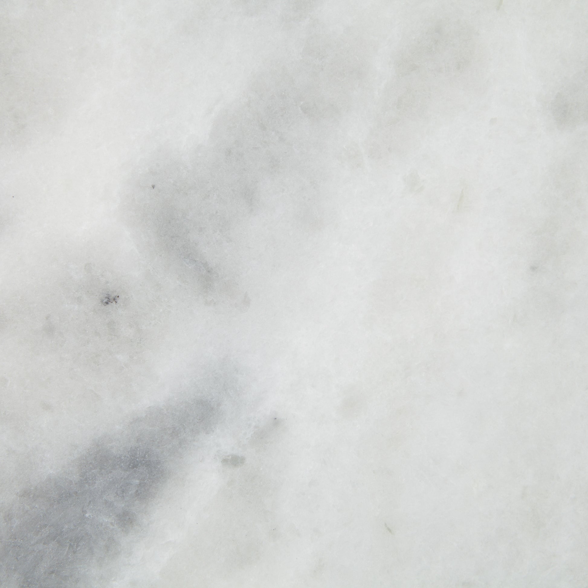 French-industrial meets bistro table. Detailed, 8-sided cast iron pedestal supports a dramatic white marble top with bull-nosed edge.