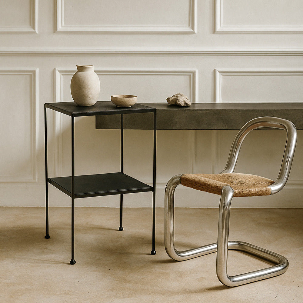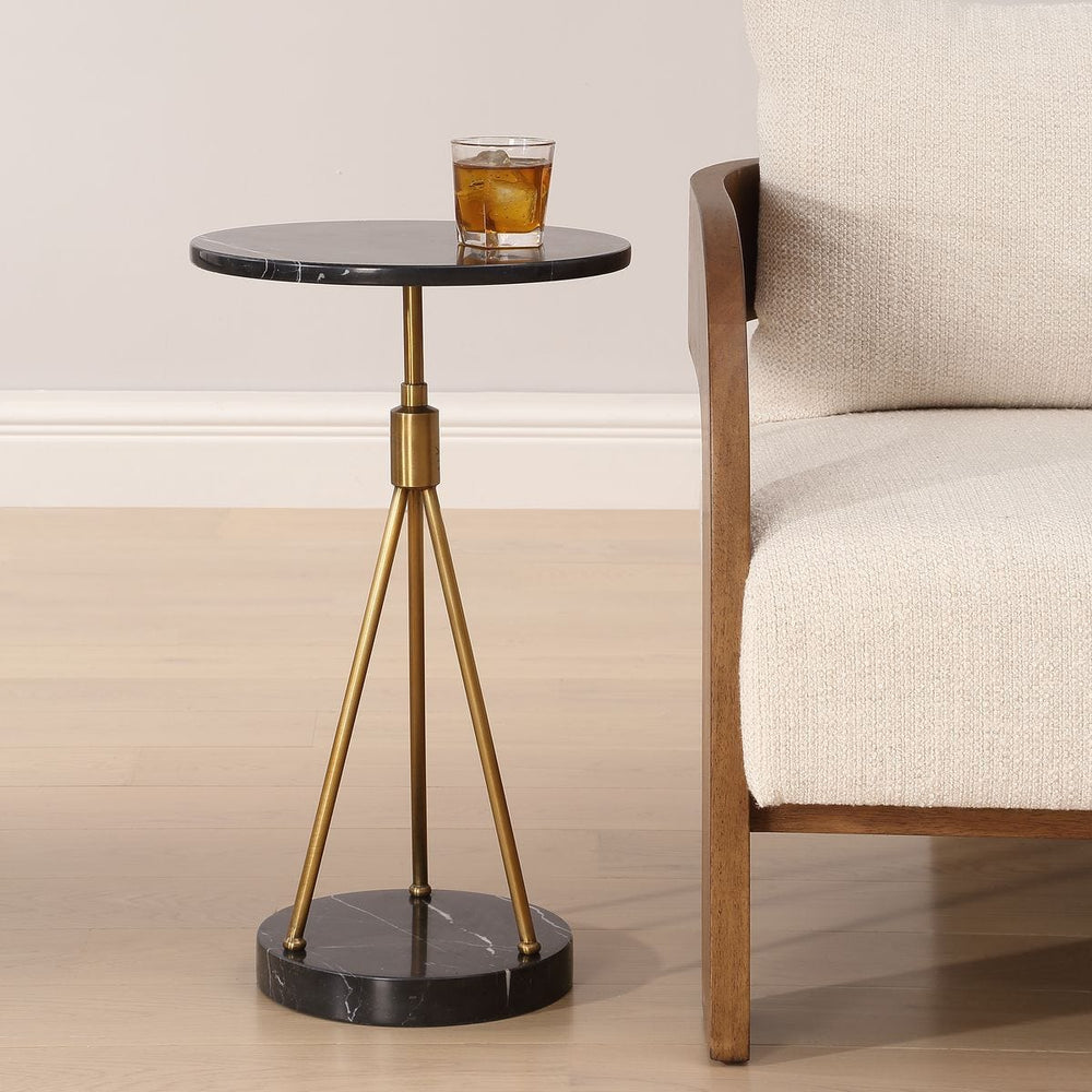 Add some bold contrast to your space with a black marble side table. Its sculptural hourglass shape and natural veining make it a standout piece.