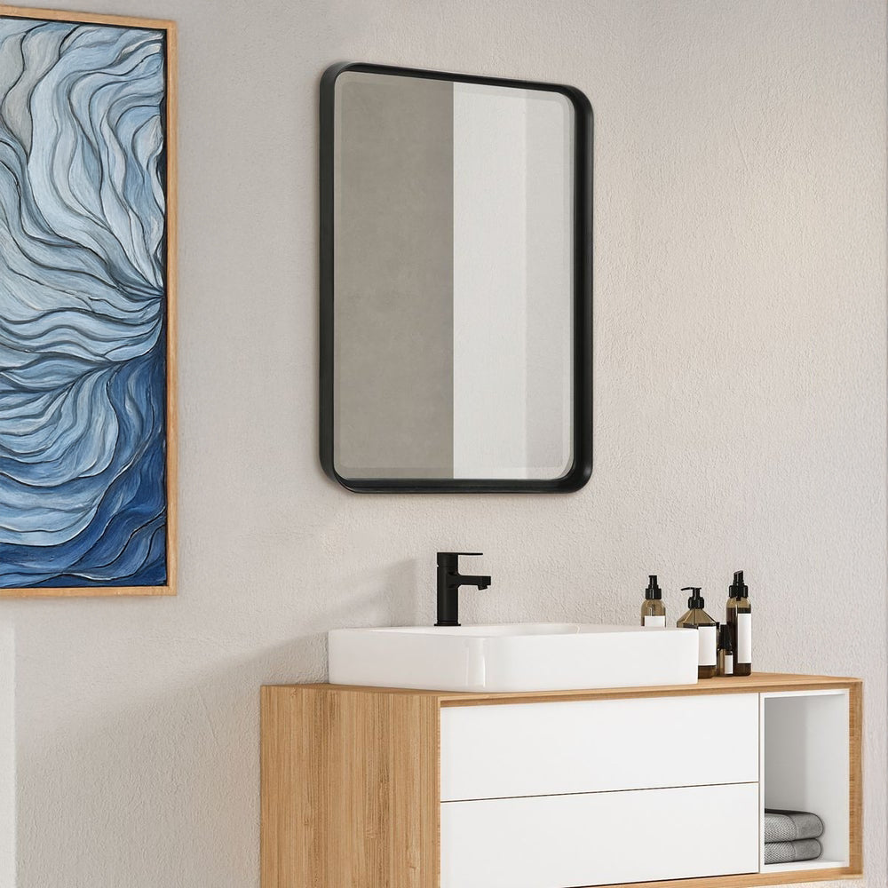 This vanity mirror is crafted from metal in the color black. All of our mirrors are made from top notch material and designed to last for the long-term. finished in matte black is constructed from a forged metal strap. The mirror has a 1 1/4" bevel and may be hung horizontal or vertical.