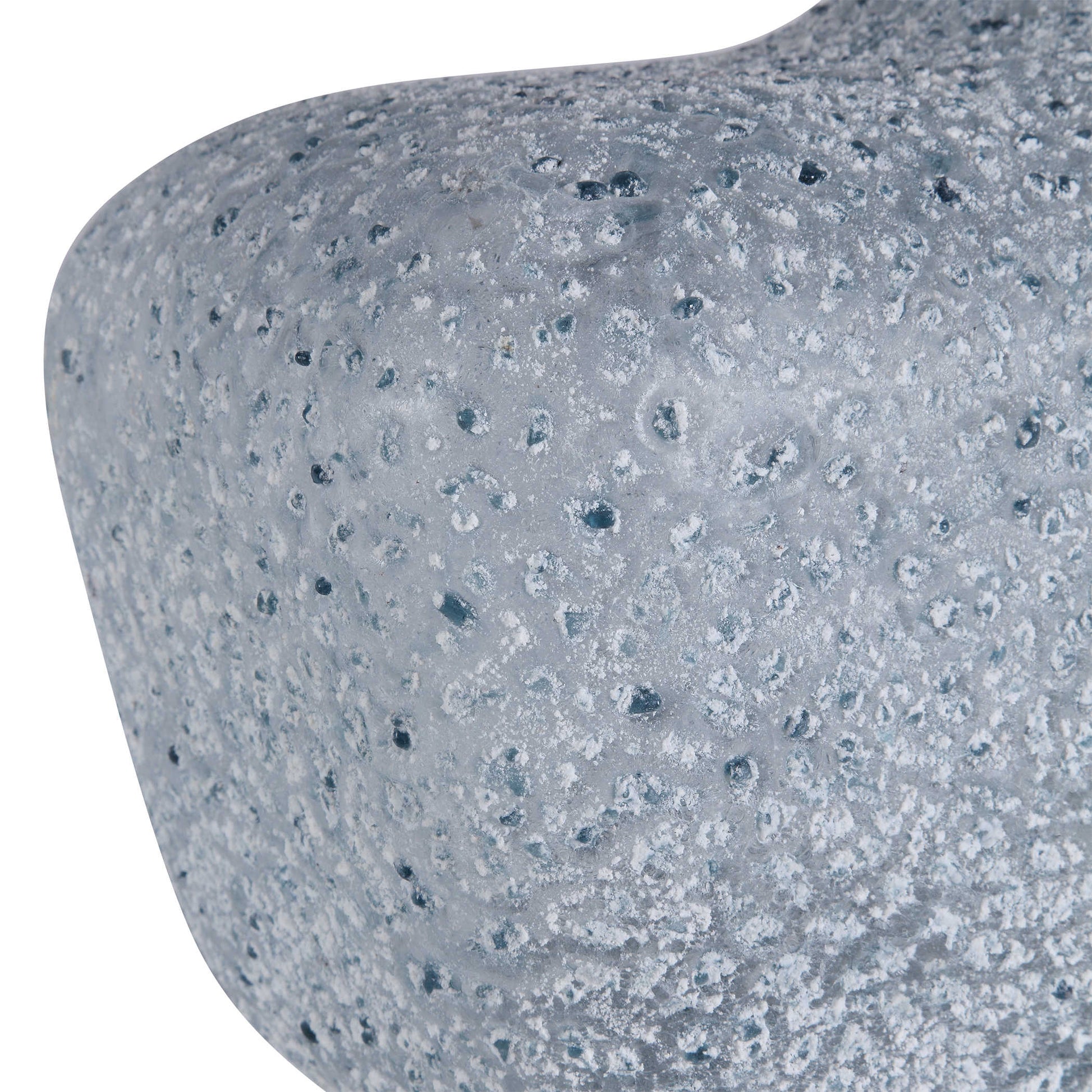 This table lamp has mottled highlights of blue-green, covered in an aged white frosted glaze This table lamp has a handcrafted look that features a heavily textured art glass base with , paired with brushed nickel plated details. The shade has a light gray linen fabric with natural slubbing.
