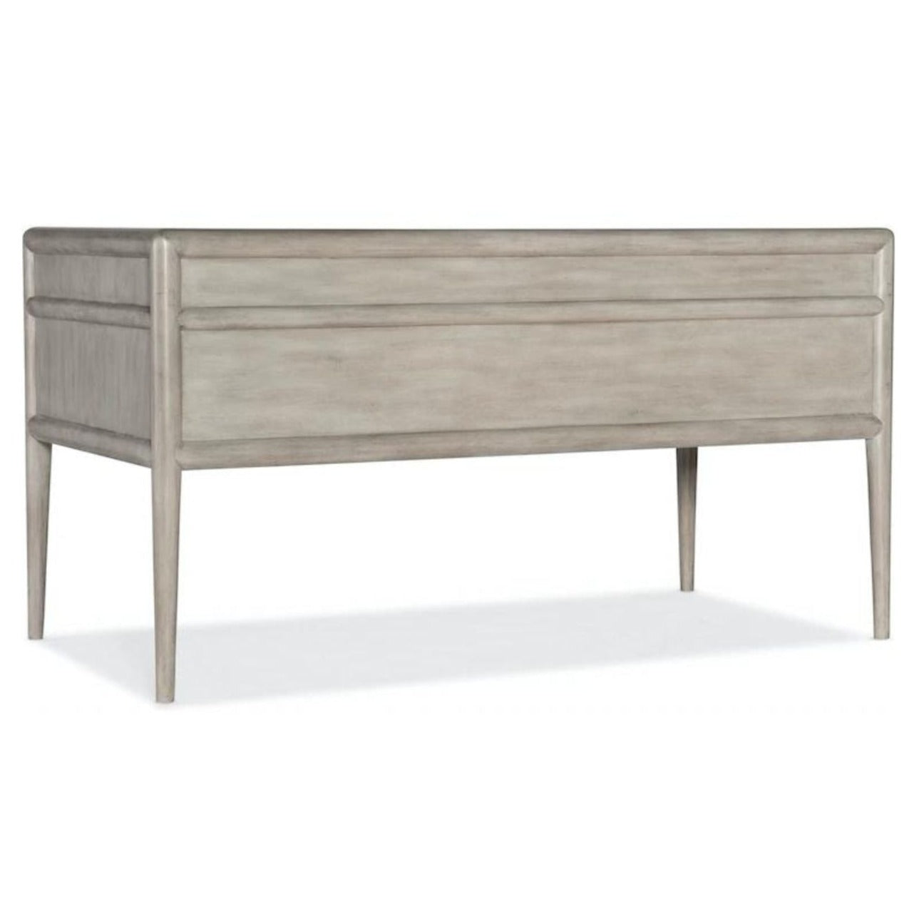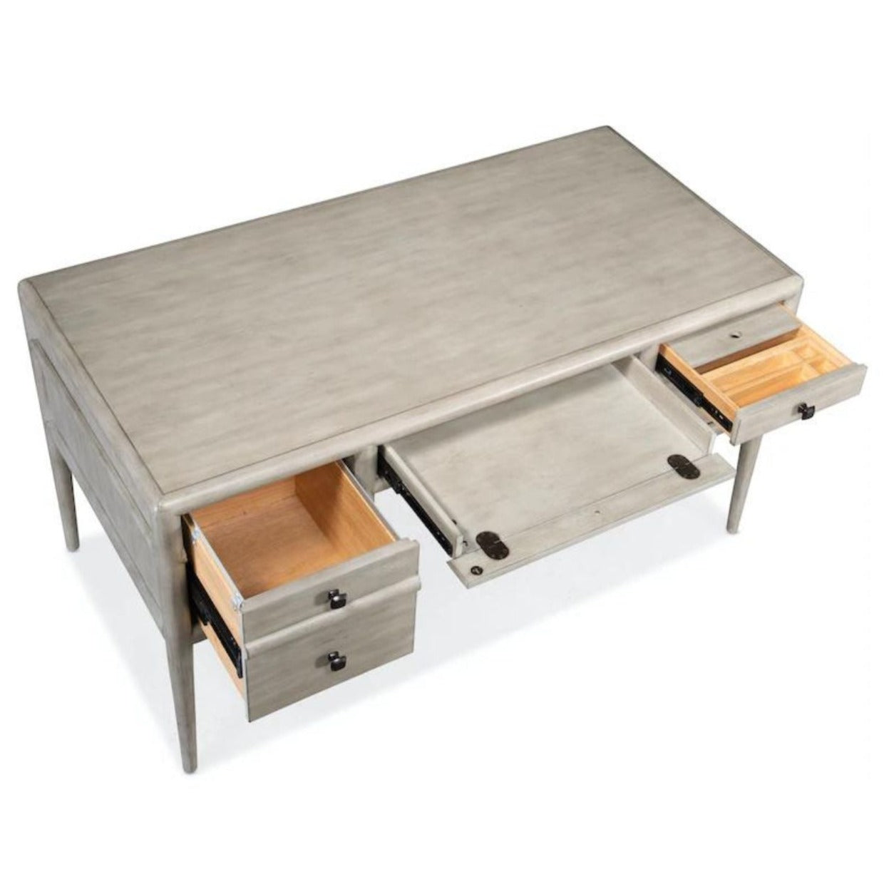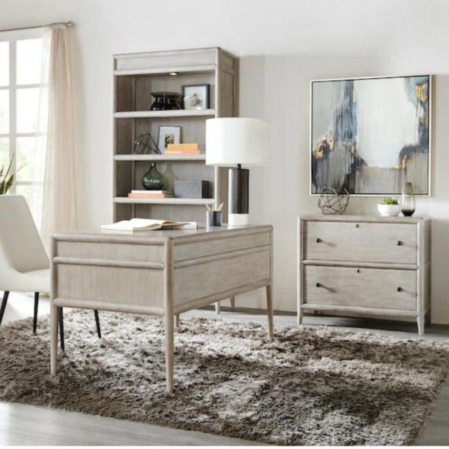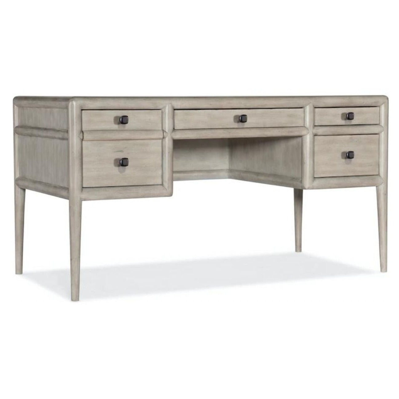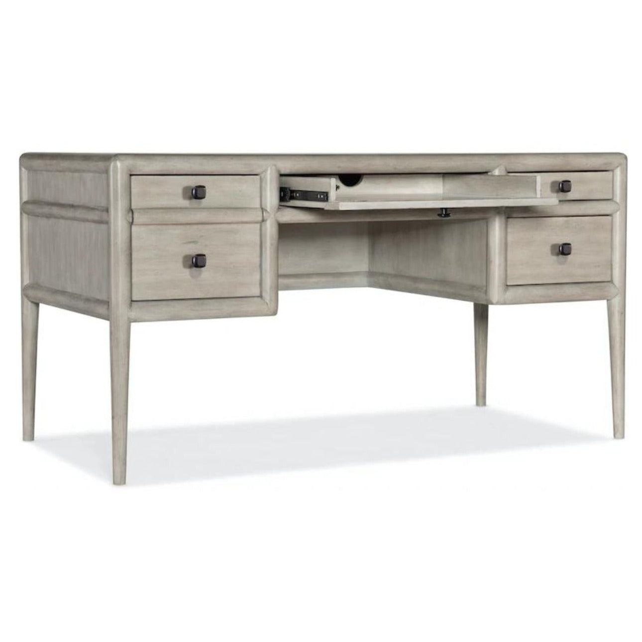 With a soft modern and casual appeal, the Burney Writing Desk is crafted of Alder Veneers with knots in a Grey Mink finish with dark bronze knob hardware. Featuring 4 drawers, the left drawer is a file drawer with pendaflex system and full extension metal ball bearing slides. The Center drawer has a drop-front for keyboard use and wire cutout in the back of drawer. The top right drawer has a removable pencil tray, inserts and removable writing slide with full extension metal ball bearing slides. The right bottom drawer has a false bottom with finger hole for hidden storage and is on full extension metal ball bearing slides. Finished on all sides. The Work Your Way program focuses on the new reality many consumers face as they continue to do much of their work from their homes. Available in five design styles, the program offers an assortment of key home office pieces for a variety of spaces Ð whether a dedicated executive home office or a more casual workstation. Ranging in scale and functionality, all of the groups within Work Your Way include an executive desk, a junior executive desk, a writing table, a lateral file, a credenza and hutch and a bookcase.