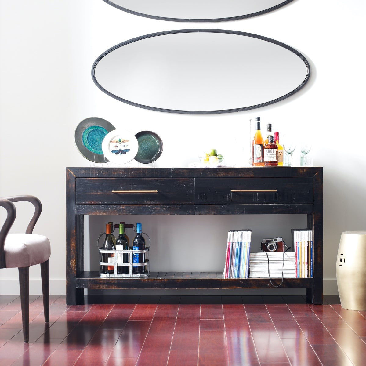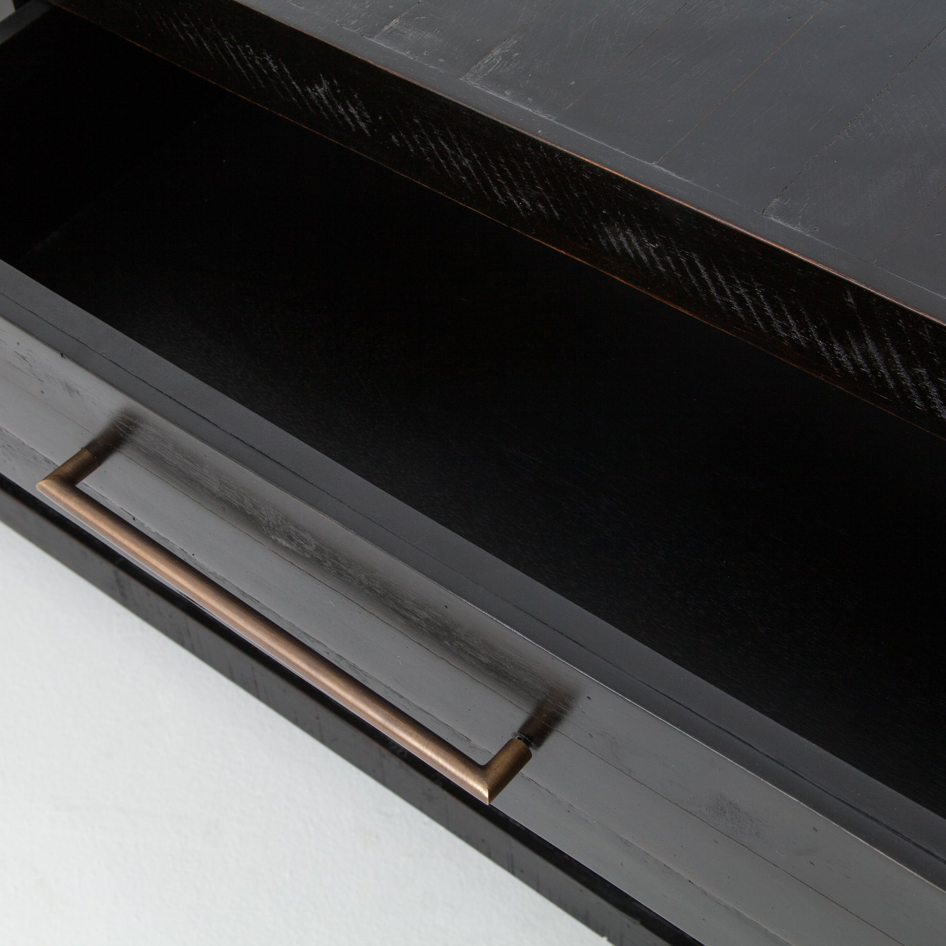 A hand-rubbed, burnished black finish draws the eye with high-low contrasts to modernize a mid-century shape. Brass-finished hardware adds a sleek touch to console's spacious dual drawers.