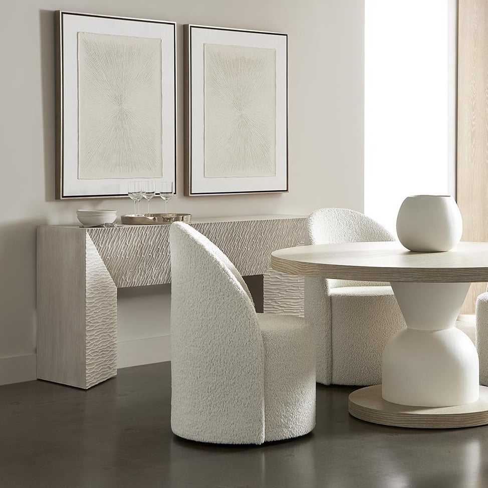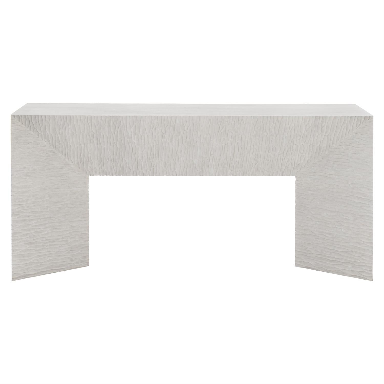 As if it were carved directly from a block of white stone, the Solaria console table offers simple lines elevated with a textural surface. Chiseled cast resin on the front and back creates an irresistible character, while the smooth white oak top and sides complement the elemental design.