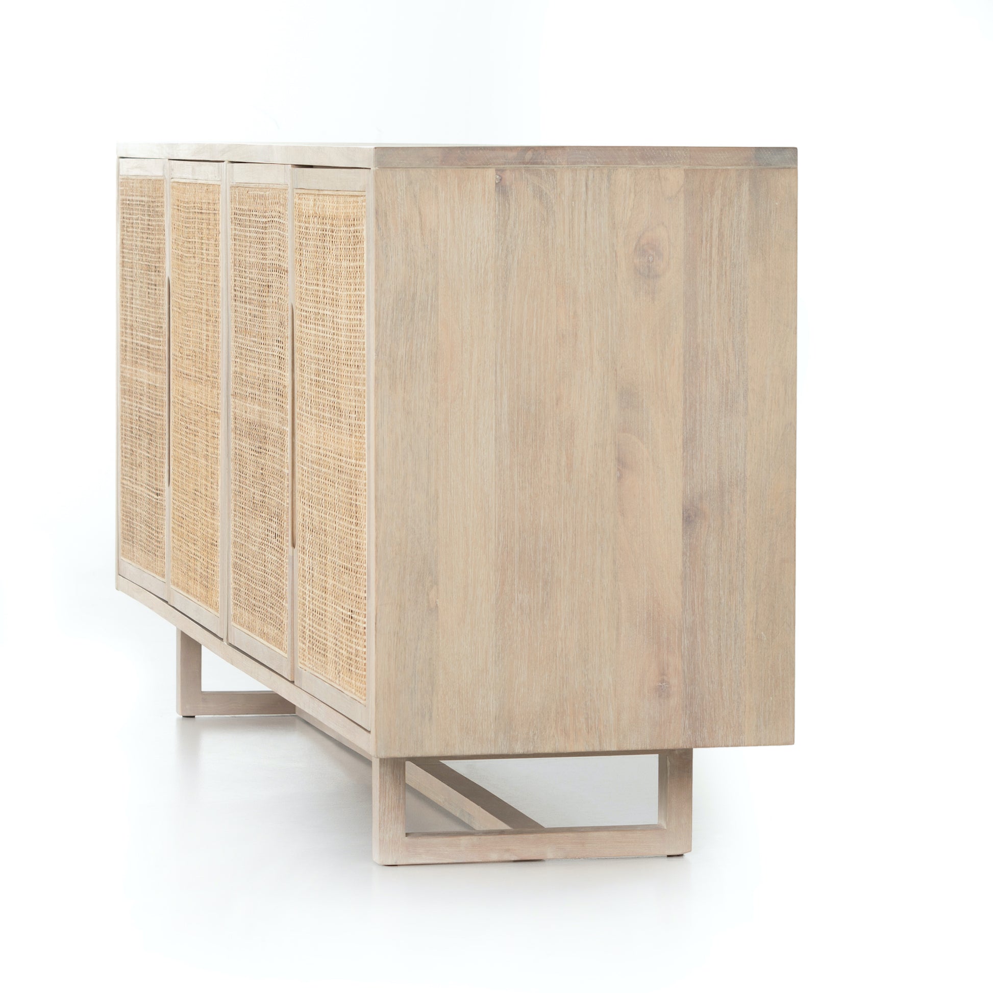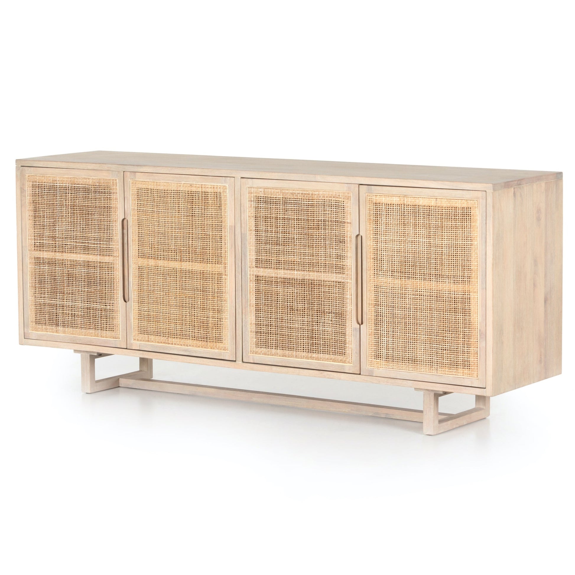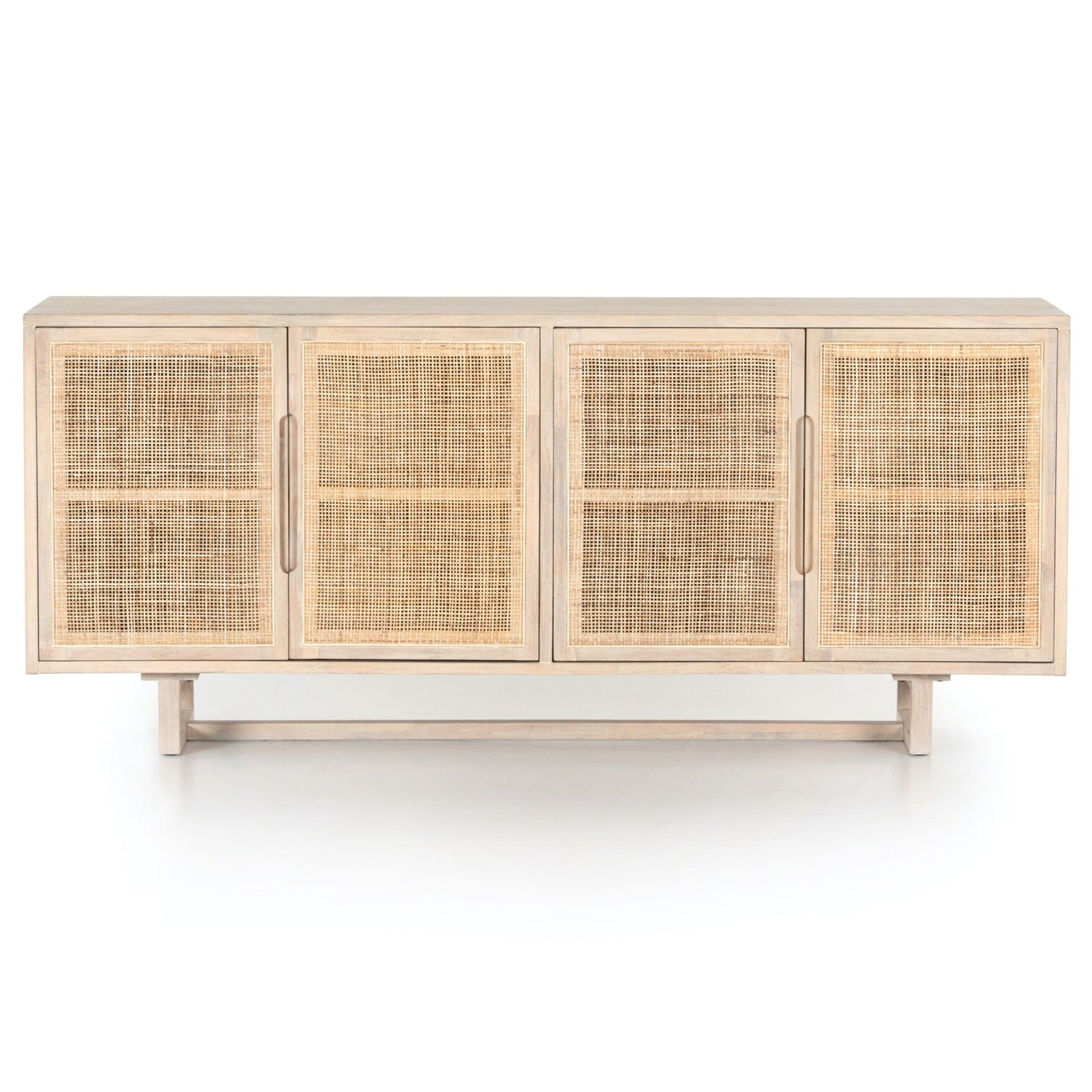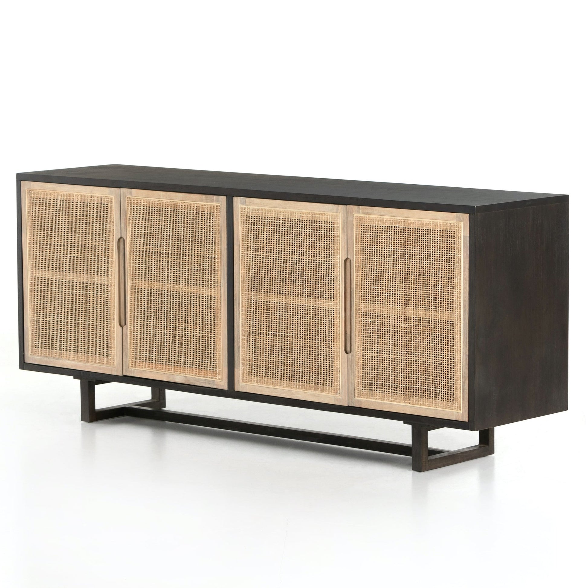 Mid century-spirited while beautifully on trend. A texture-driven sideboard of black-washed mango features white mango door fronts with natural cane paneling. Spacious interior for plenty of storage space, with adjustable shelving plus rear cutouts for cord management.