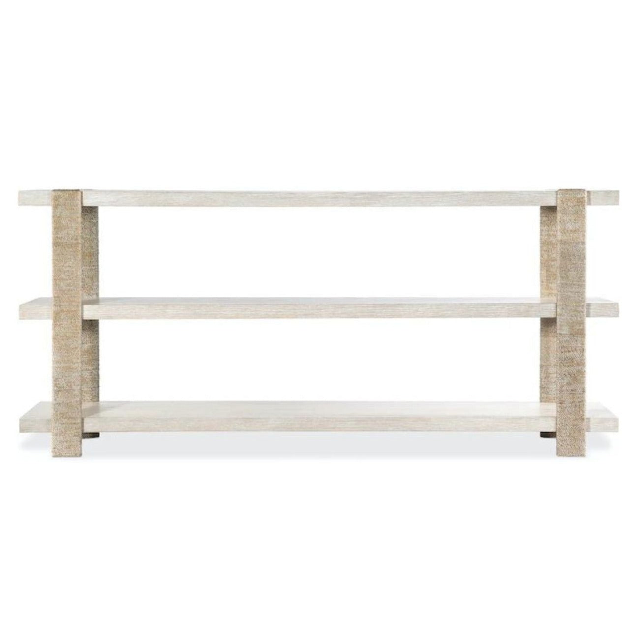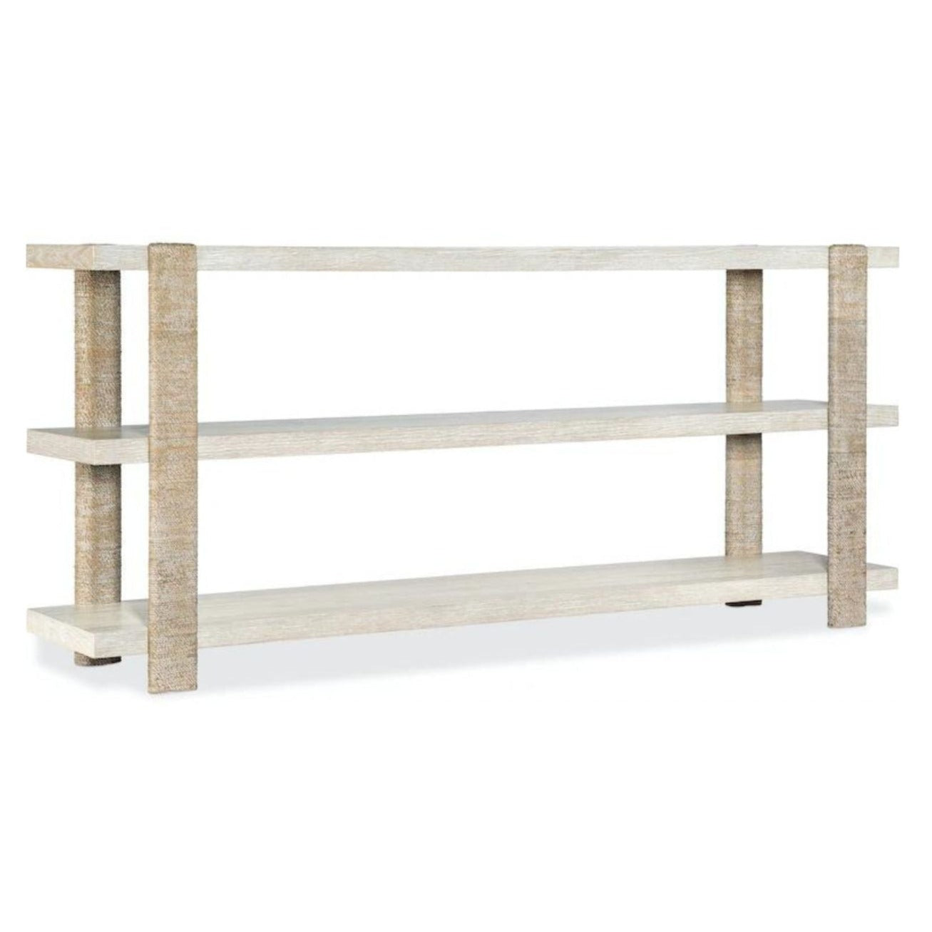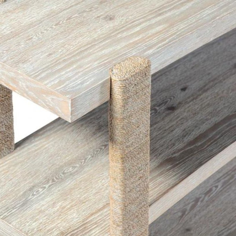 Crafted of Oak Veneers with an open grain pattern with rope-wrapped supports, the Commerce Console Table has a light and airy natural wood finish, a tactile quality and a youthful vibe. Two fixed shelves with open sides and back.