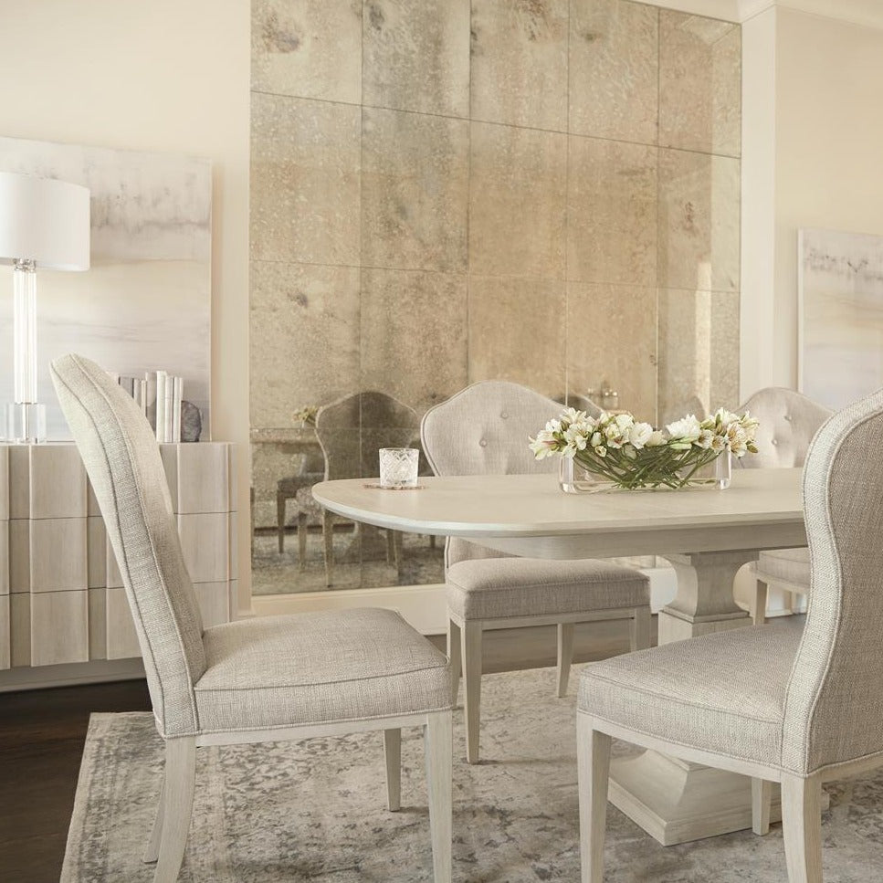 The three-drawer hall chest features shaped vertical overlays, adding depth and dimension to the minimalist design. Quartered ash veneers are presented in a Cerused Linen finish, created using light wire brushing and cerusing techniques to highlight the linear wood grain. The soft finish blends with the subtle curvature of the overlays to create a look that is slightly feminine. Slender tapered feet contribute to the clean, modern aesthetic.