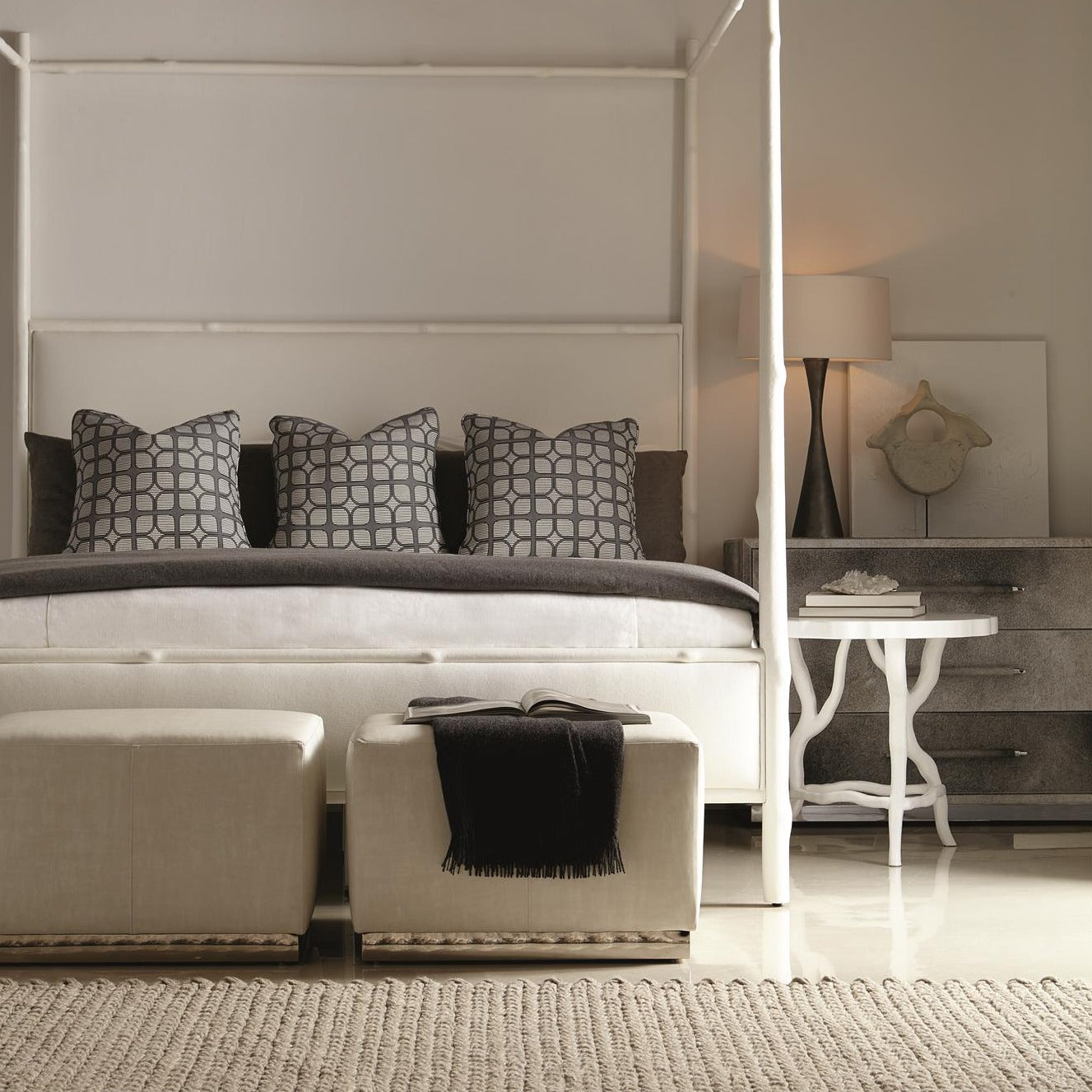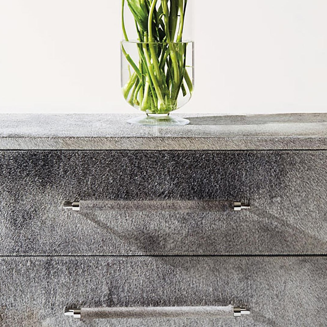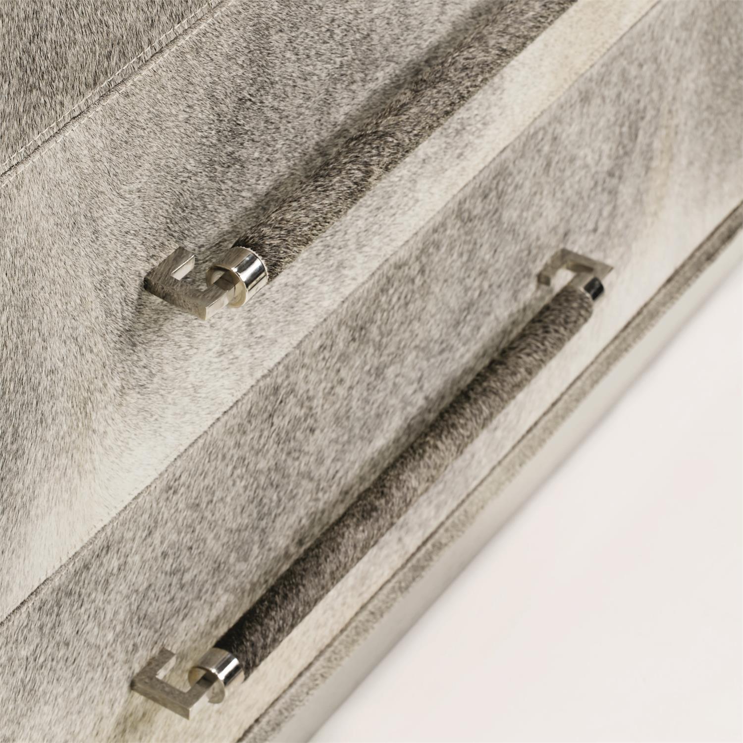 Wrapped in gray hair-on-hide, the chest abounds with texture and natural appeal. Saddle stitching draws attention to the fine craftsmanship, while a white painted interior and white felt lining in the three drawers contribute to the unique character of the piece. A polished stainless steel plinth base adds shine to this modern luxe look.