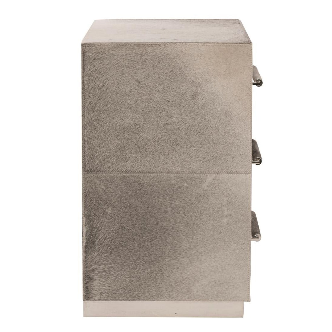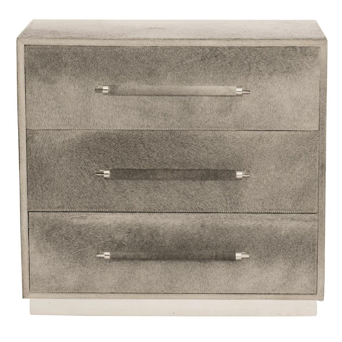 Wrapped in gray hair-on-hide, this nightstand abounds with texture and natural appeal. Saddle stitching draws attention to the fine craftsmanship, while a white painted interior and white felt lining in the three drawers contribute to the unique character of the piece. A polished stainless steel plinth base adds shine to this modern luxe look.