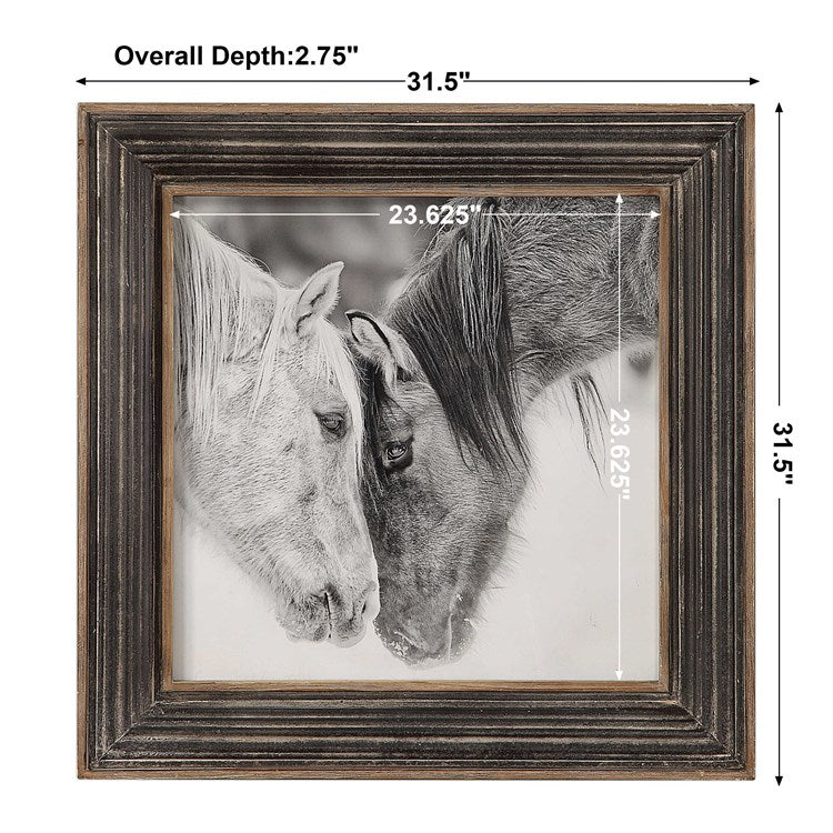 Rustic charm is added to a design with this black and white printed photograph. The transitional animal print is surrounded by a distressed wood and metal frame with corrugated style ridges. A distressed black finish and gray wash adds dimension to this piece. This print is placed under protective glass. Artwork by Ph Burchett.