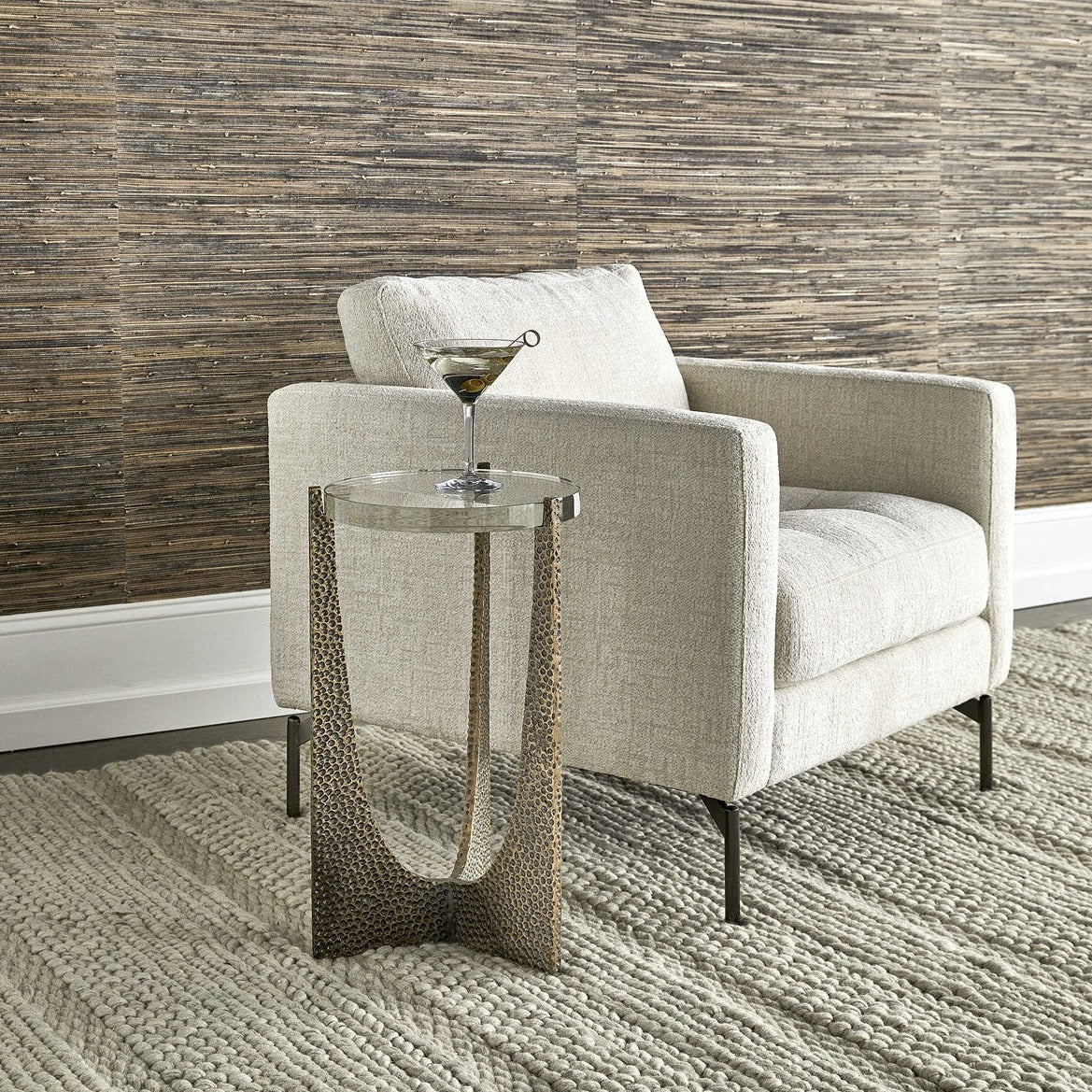 A thick crystal top is on display, secured with prongs like a diamond ring. The sleek, minimal-profile base is made of hammered steel, finished in a golden bronze.