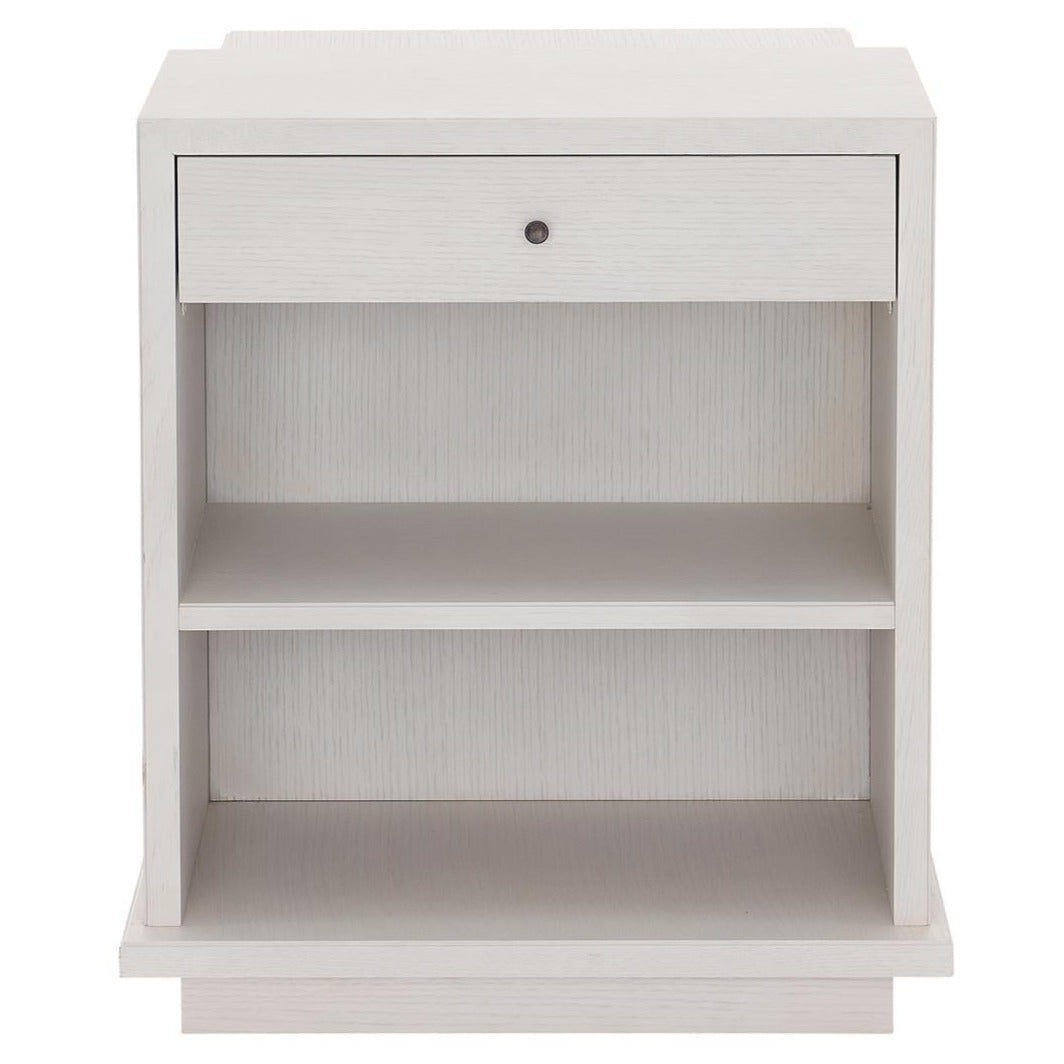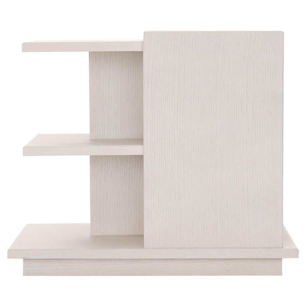 The front features a single drawer and two shelves, while the back features two open shelves with a vertical partition. Wire-brushed quartered oak veneers are finished in linear white for a look of understated luxury.