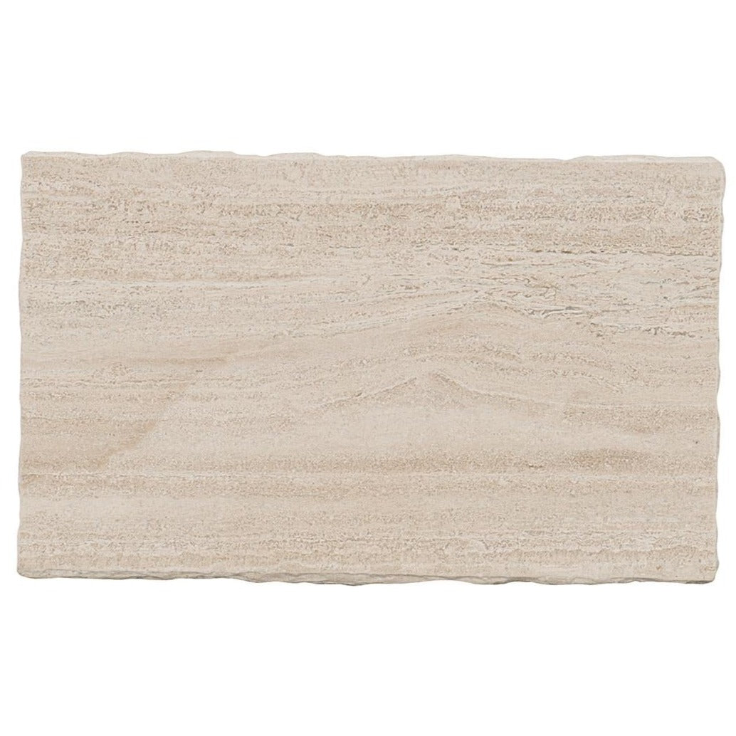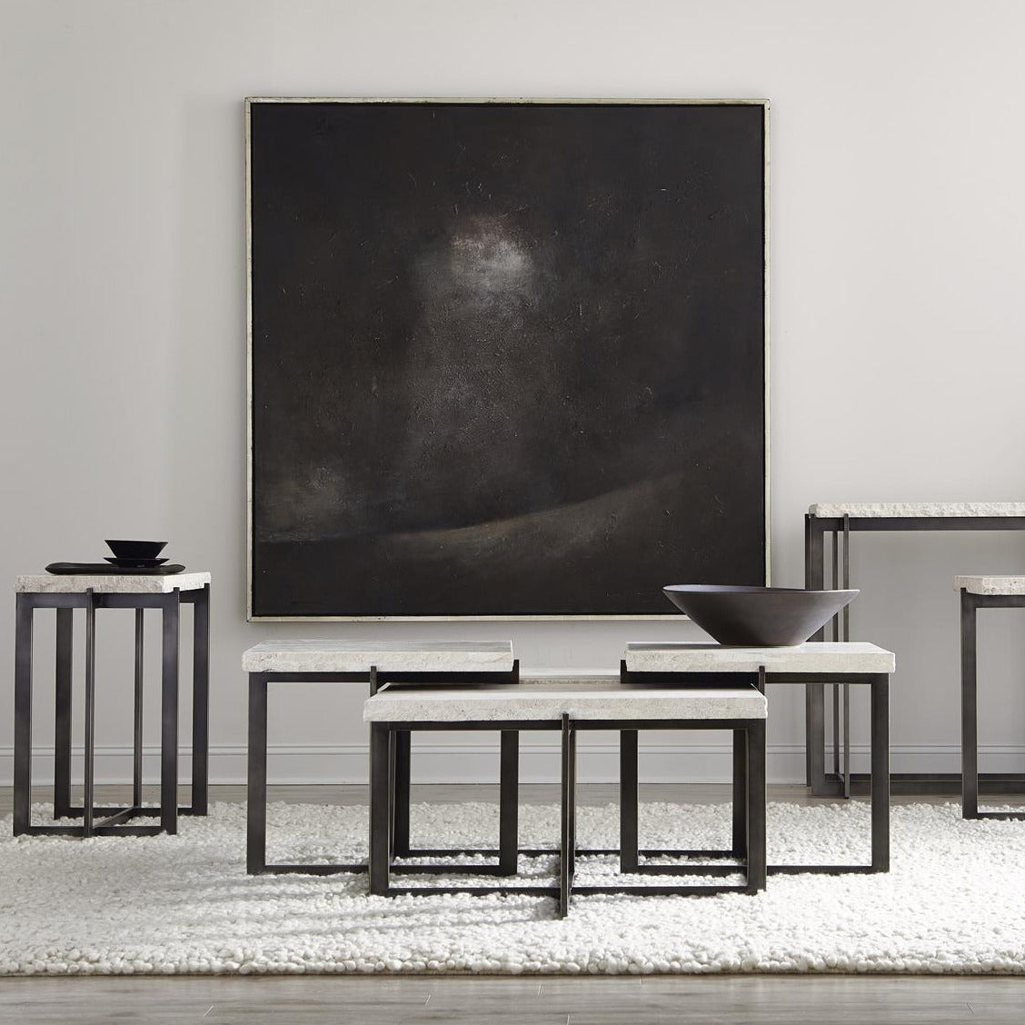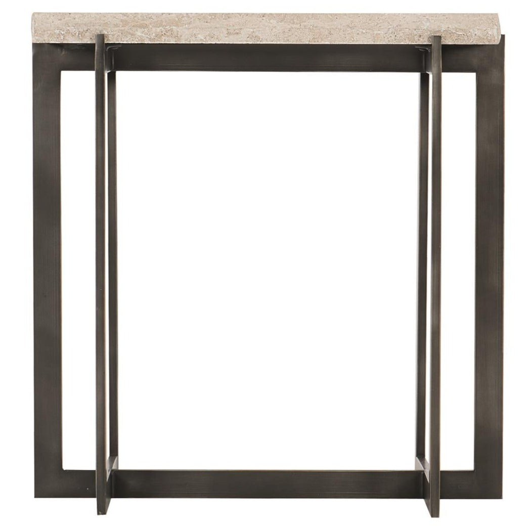 This drink table is a sleek tubular steel base providing structural stability and clean, bold lines. An oil-rubbed bronze finish on the base creates an engaging contrast with the white travertine stone top,with a chiseled edge.