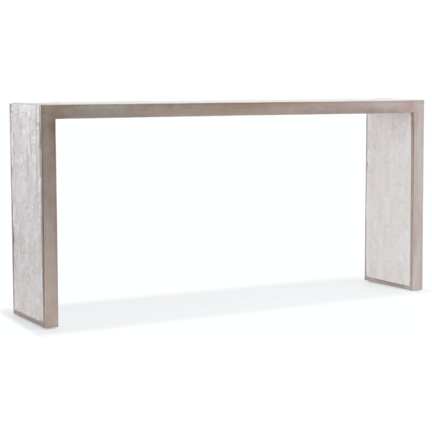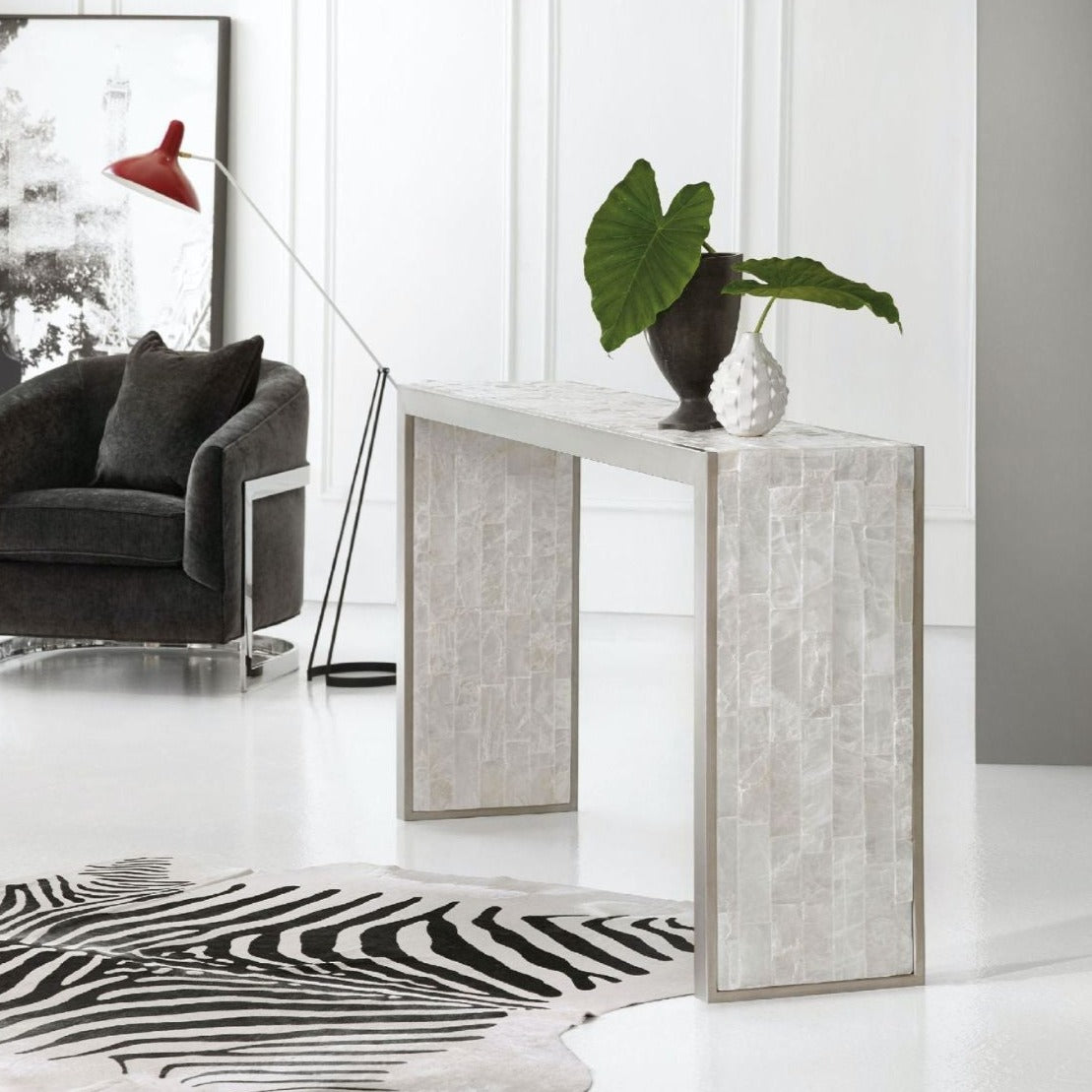 Like a heavenly vision, the graceful E Console floats stylishly in your room. Crafted of faux silver leaf on metal with a Selenite top, the slim table has a serene white, cream and beige color palette. Come closer to Melange, and you will discover something unexpected, an eclectic blending of colors, textures and materials in a vibrant collection of one-of-a-kind artistic pieces.