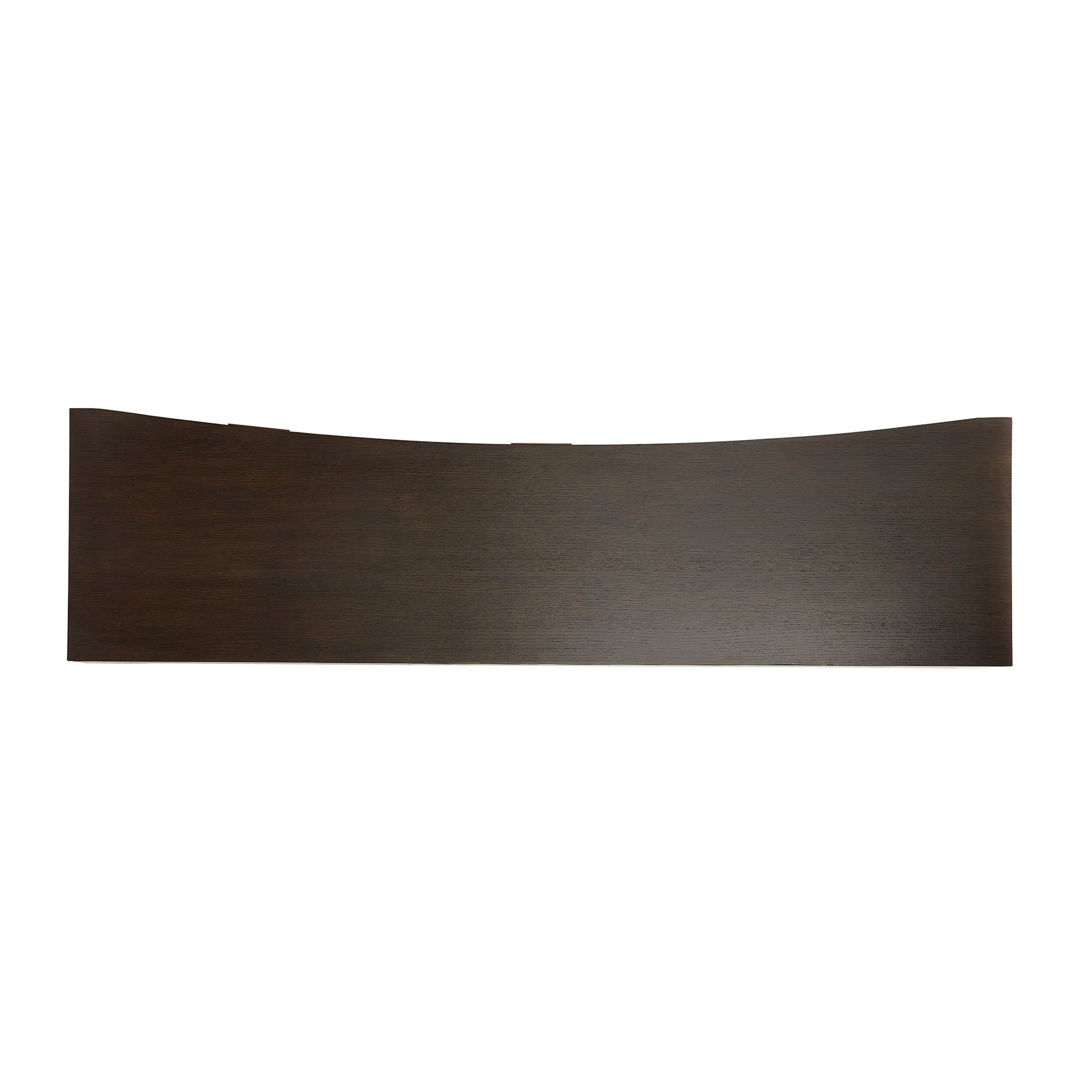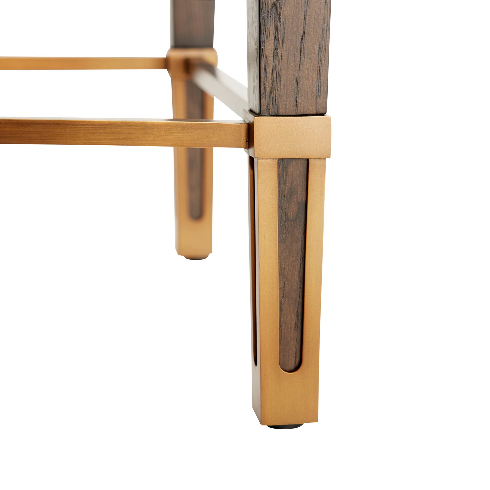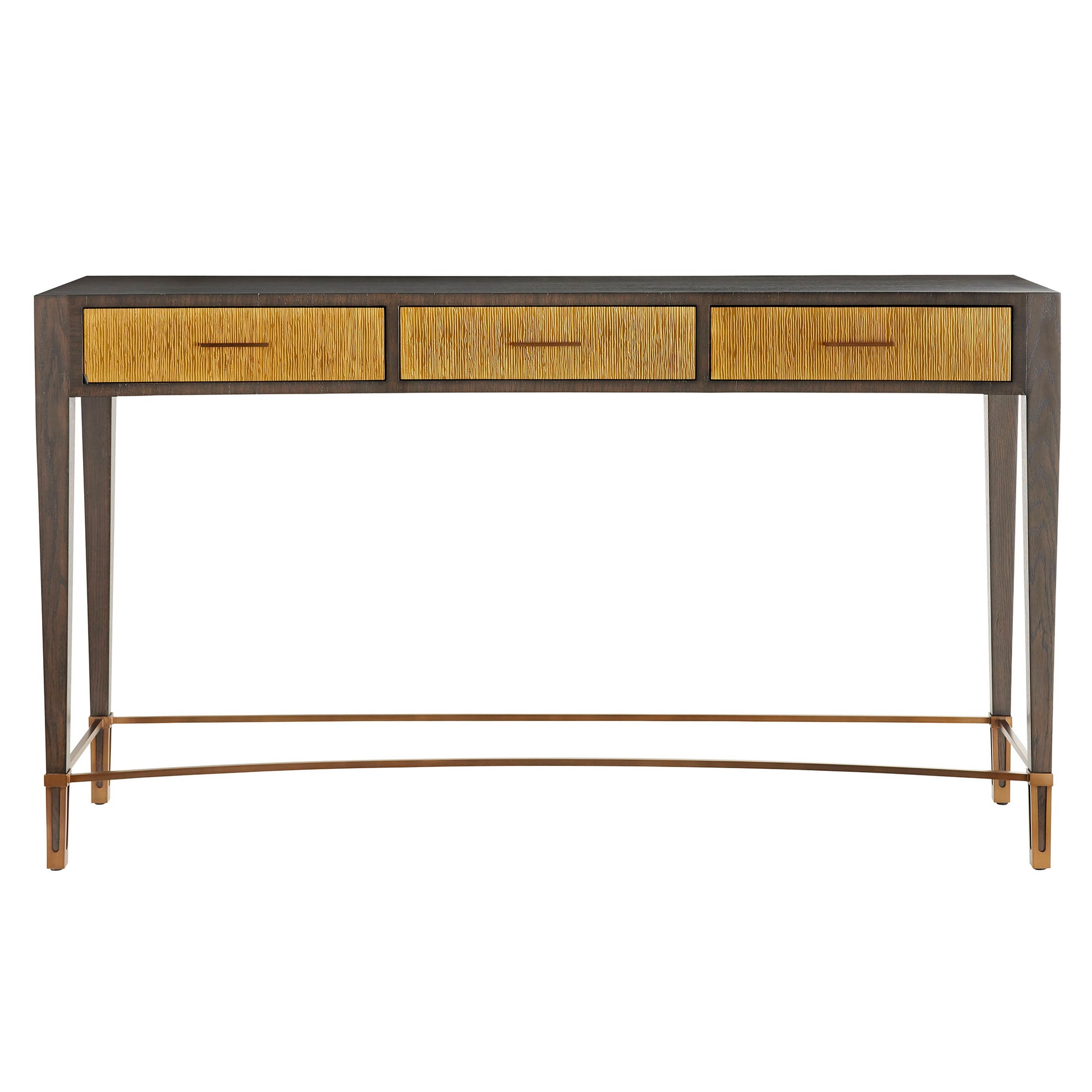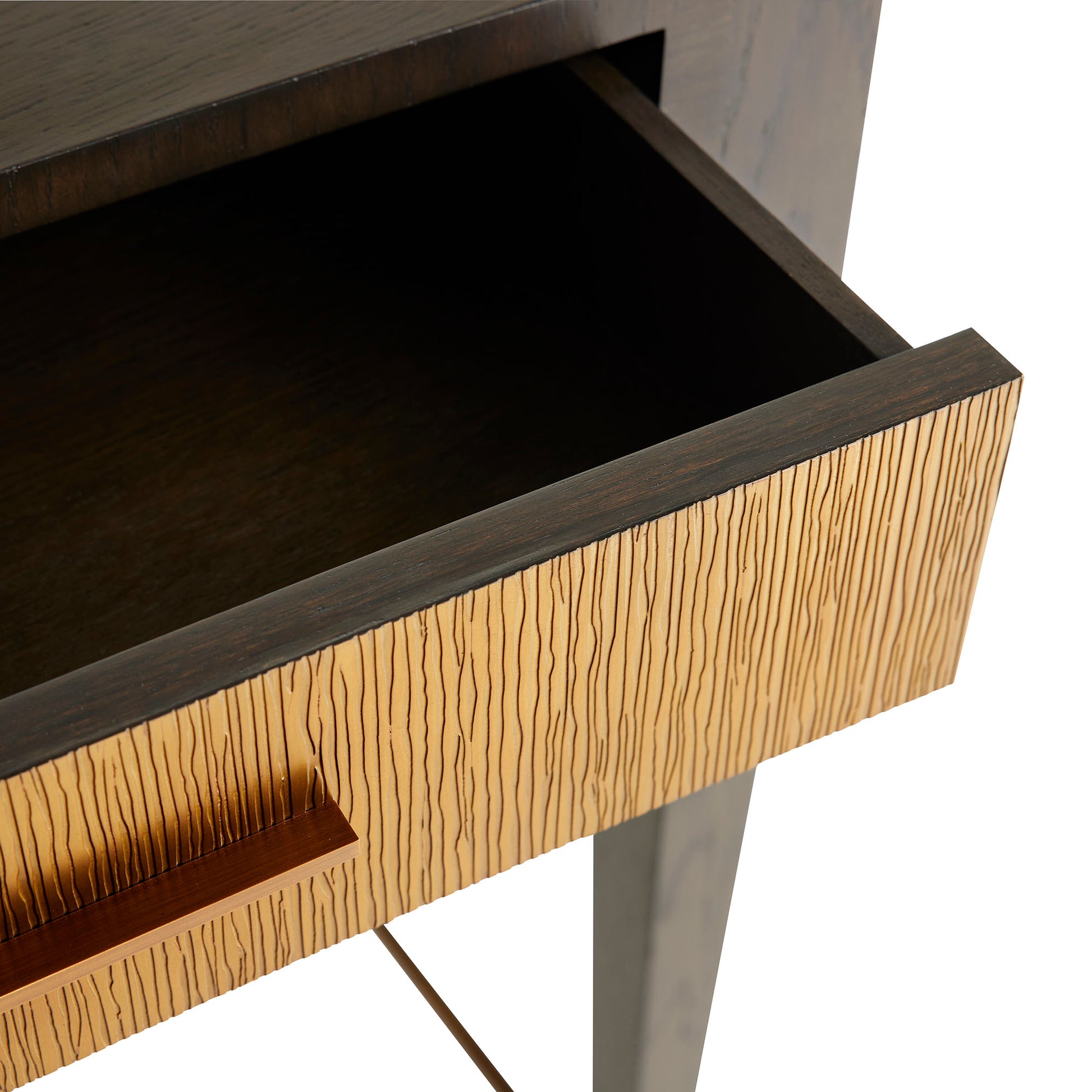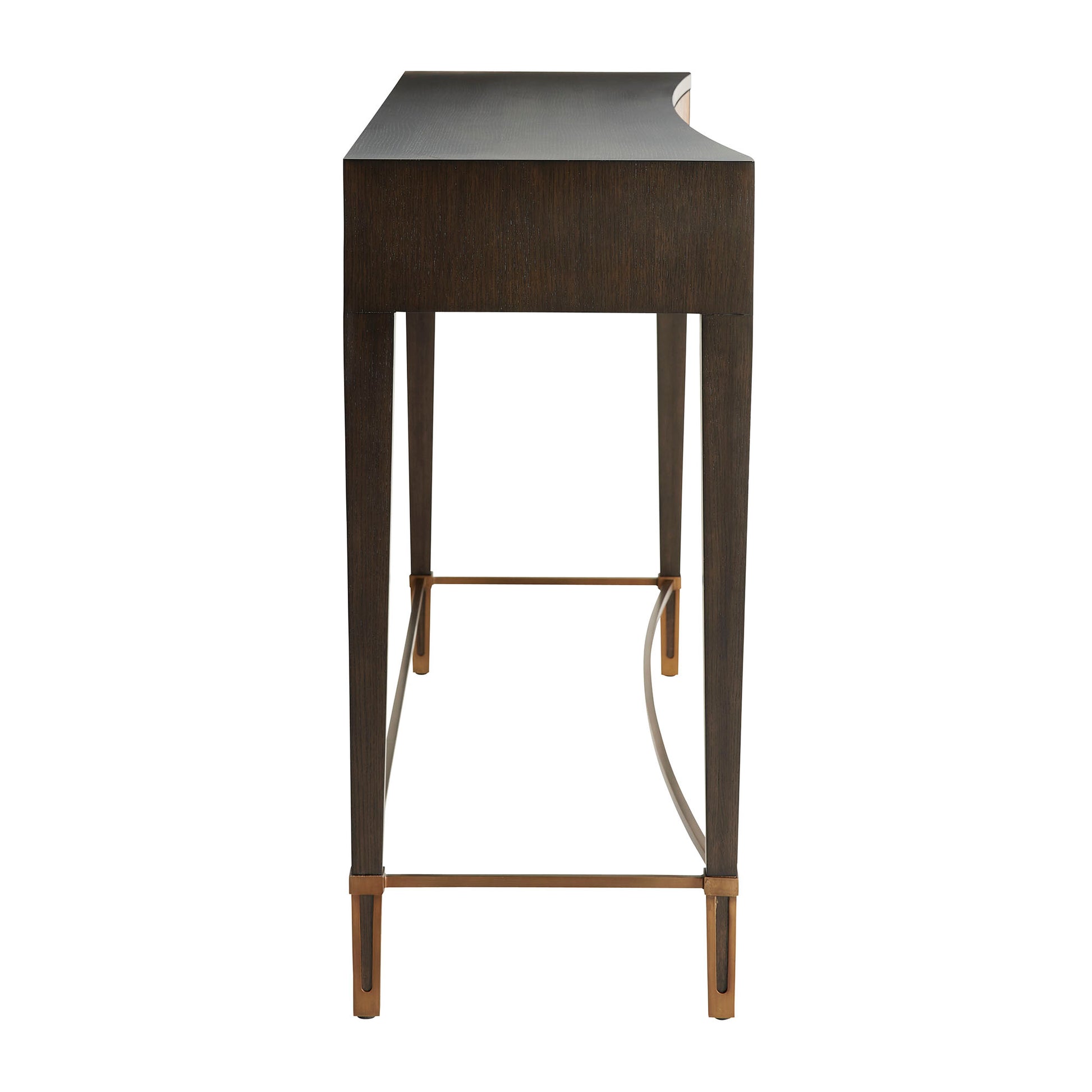 BEAUTIFULLY CRAFTED, THE LANCASTER CONSOLE IS THE FOCAL POINT OF ANY ROOM. AN EBONY TONED OAK VENEER FOUNDATION IS CONTRASTED BY ANTIQUE BRASS CLAD DRAWER FRONTS FEATURING A UNIQUE ETCHED TEXTURE. A CURVED PROFILE IS COMPLEMENTED BY SIMPLE, STRAIGHT DRAWER-PULL HARDWARE AND UNIQUE CAGED FERRULES TO FINISH OFF THE LEGS. CLADDING AND WOOD MAY VARY.