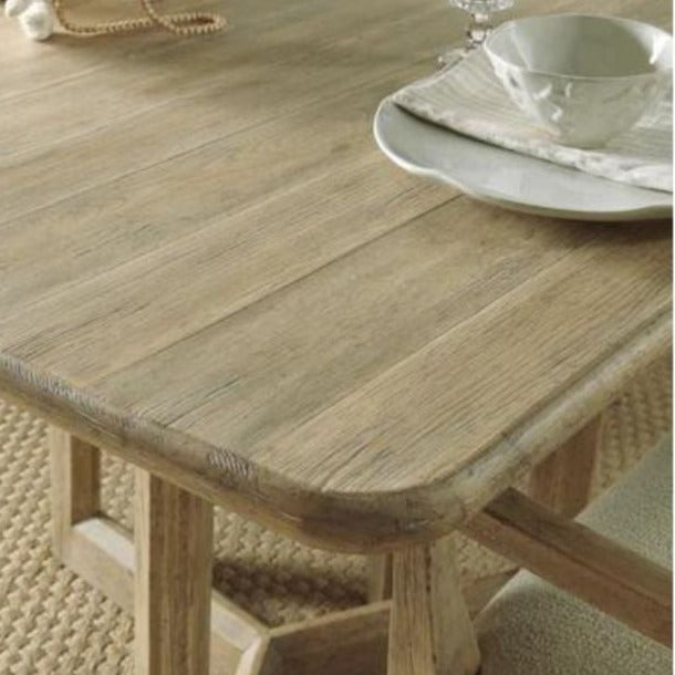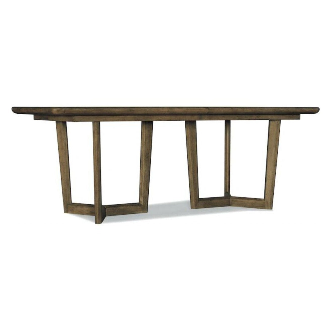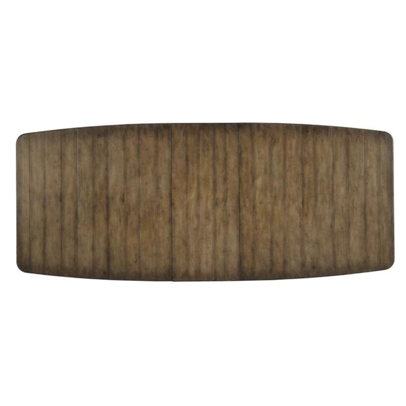 Inspired by the California coast, this combines a solid wood-edge top crafted of Pecan Veneers with an airy double base. Finished in the light natural Driftwood finish (or a rich brown finish), the table offers two 18-inch leaves, extending the table to 118 inches, accommodating 2 arm chairs and 6 side chairs with the leaf included. Luxurious materials, shapes and textures combine to create a relaxed, yet sophisticated style that epitomize the lifestyle of a casual, beach-town community.