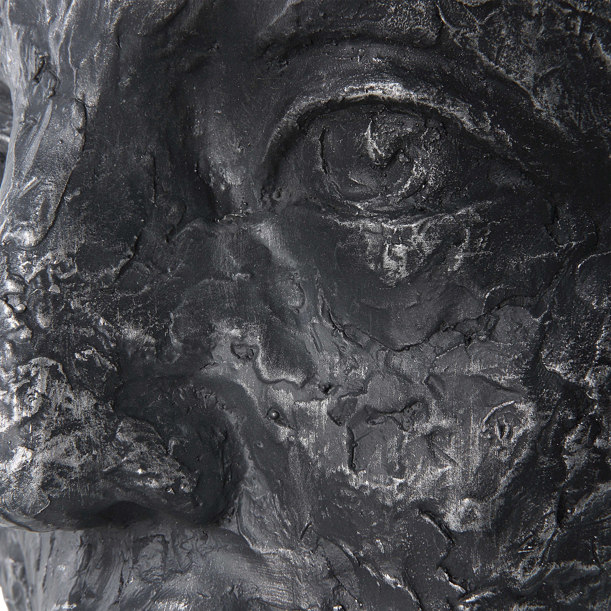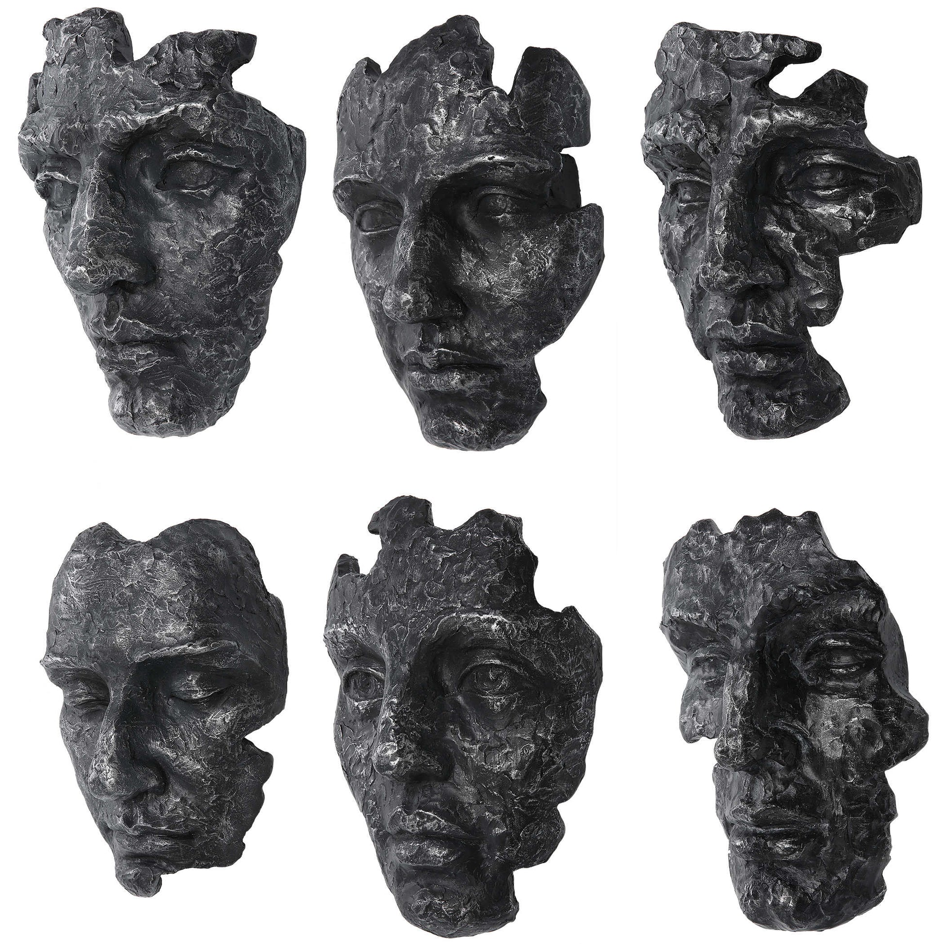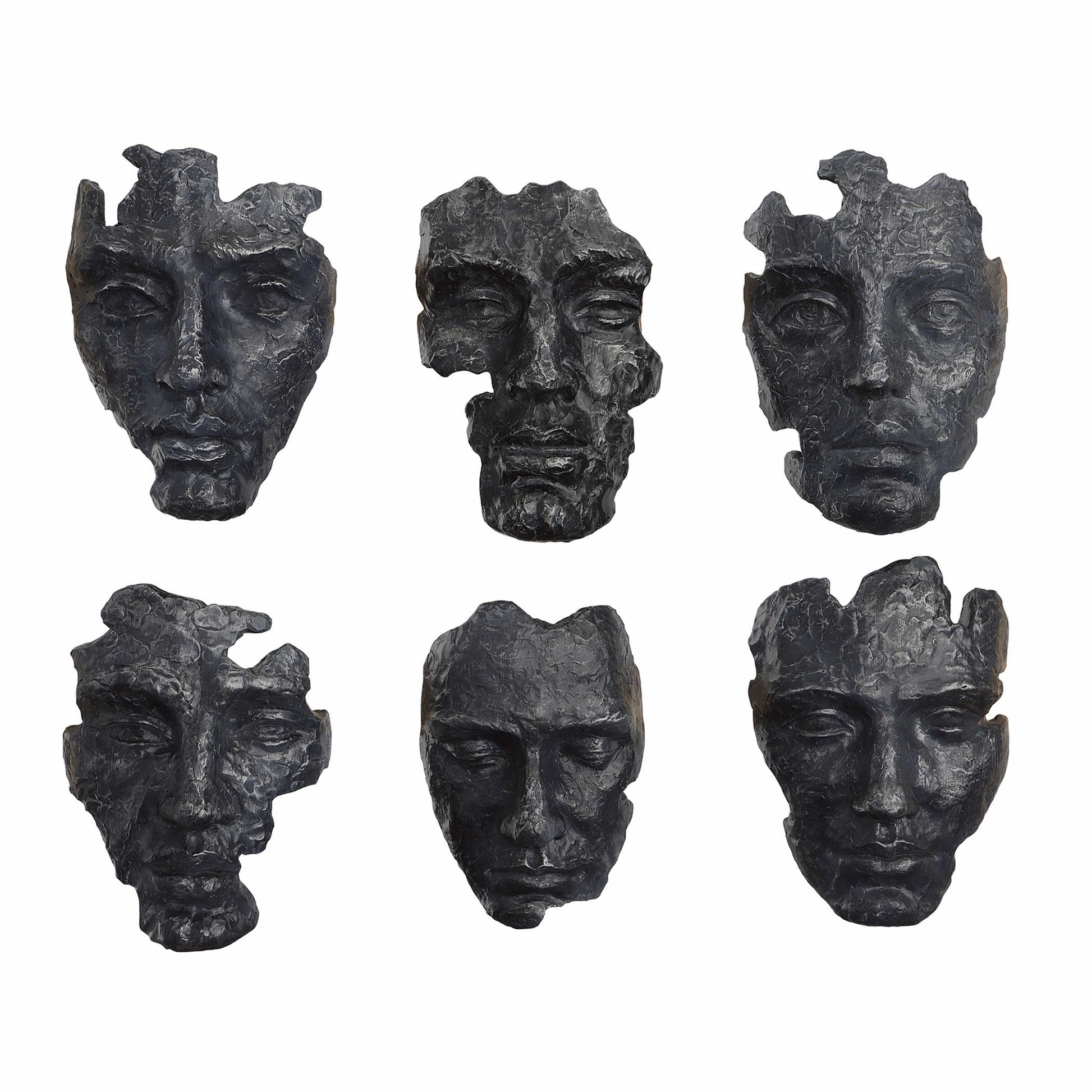 Inspired by works from modern art galleries, these masks are handcrafted with a sculpted look in a patinated steel gray finish with noticeable metallic details and texture.