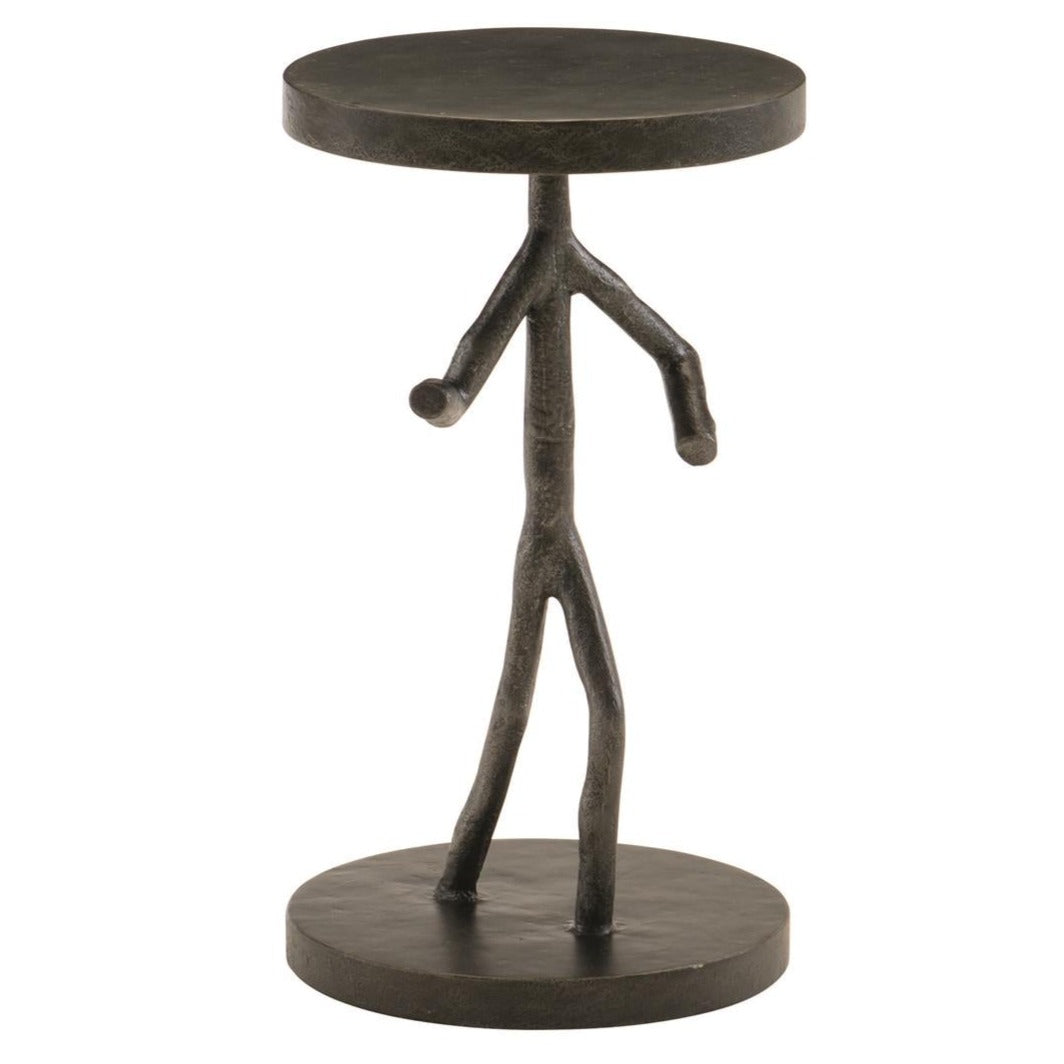 This imaginative accent table dances between a round top and base. Crafted from heavily textured cast iron.