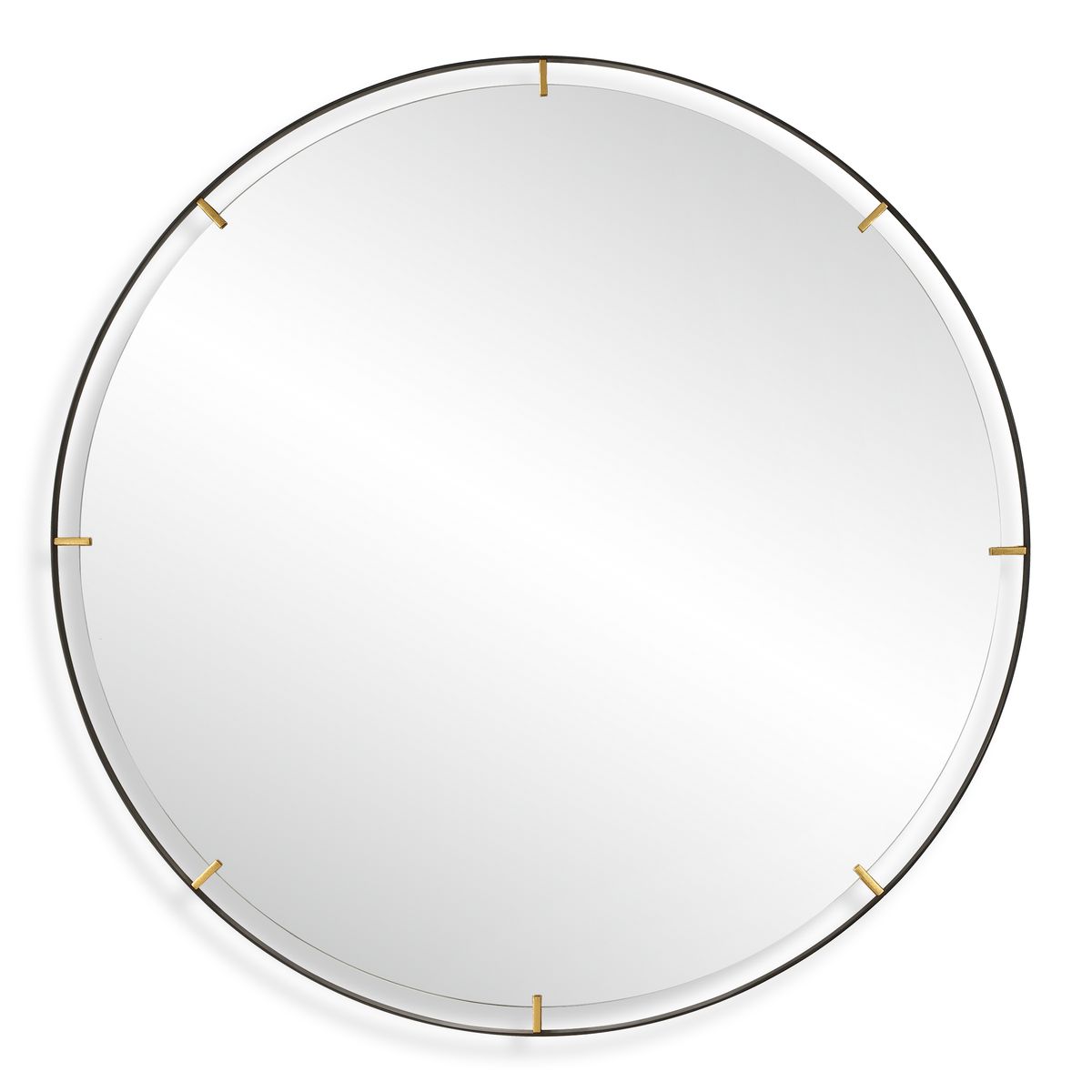 Elevate your home decor with our Grand Pendulum Round mirror. Crafted with a hefty black iron frame accented by lightly antiqued gold clips that help suspend a polished edge mirror for a statement piece in any room.