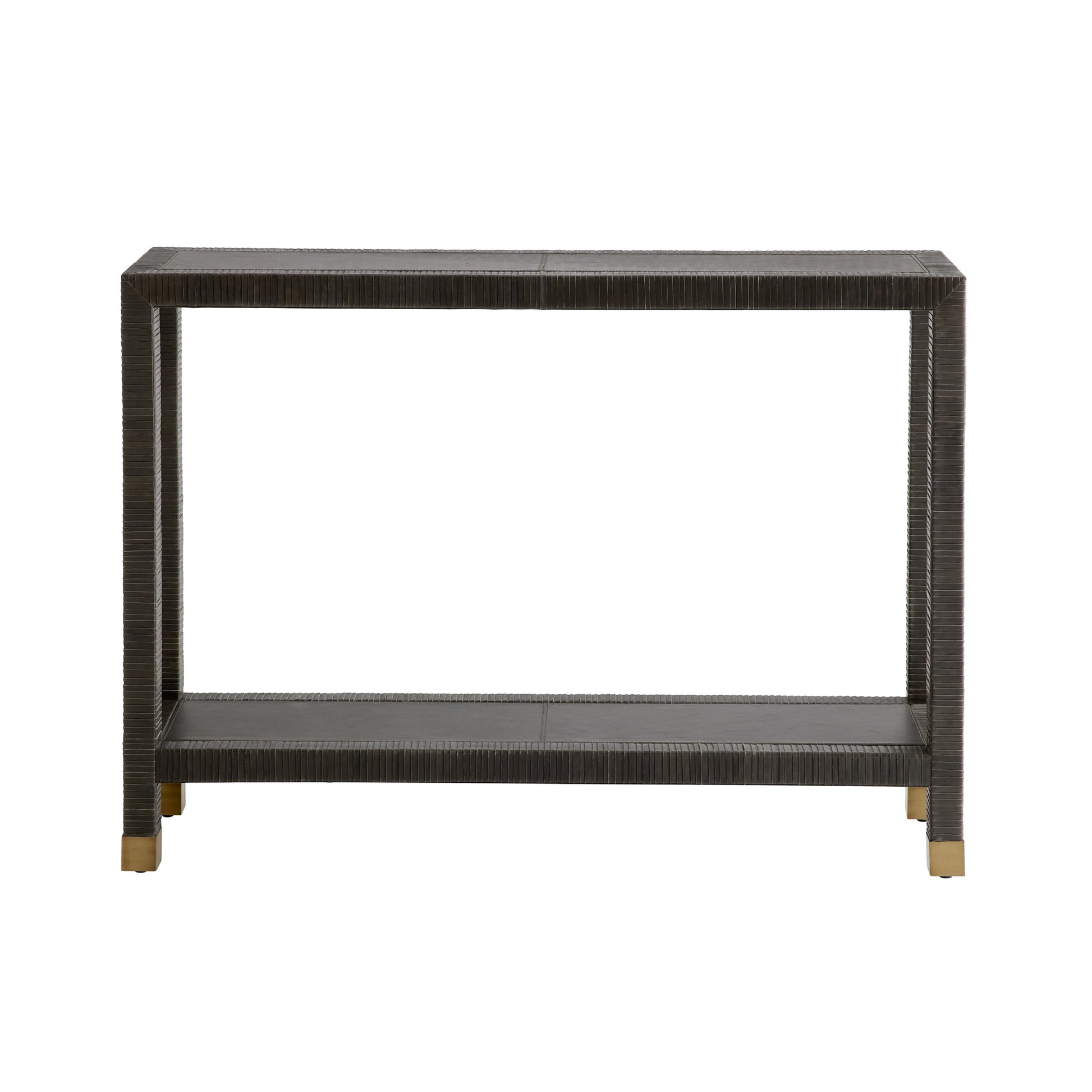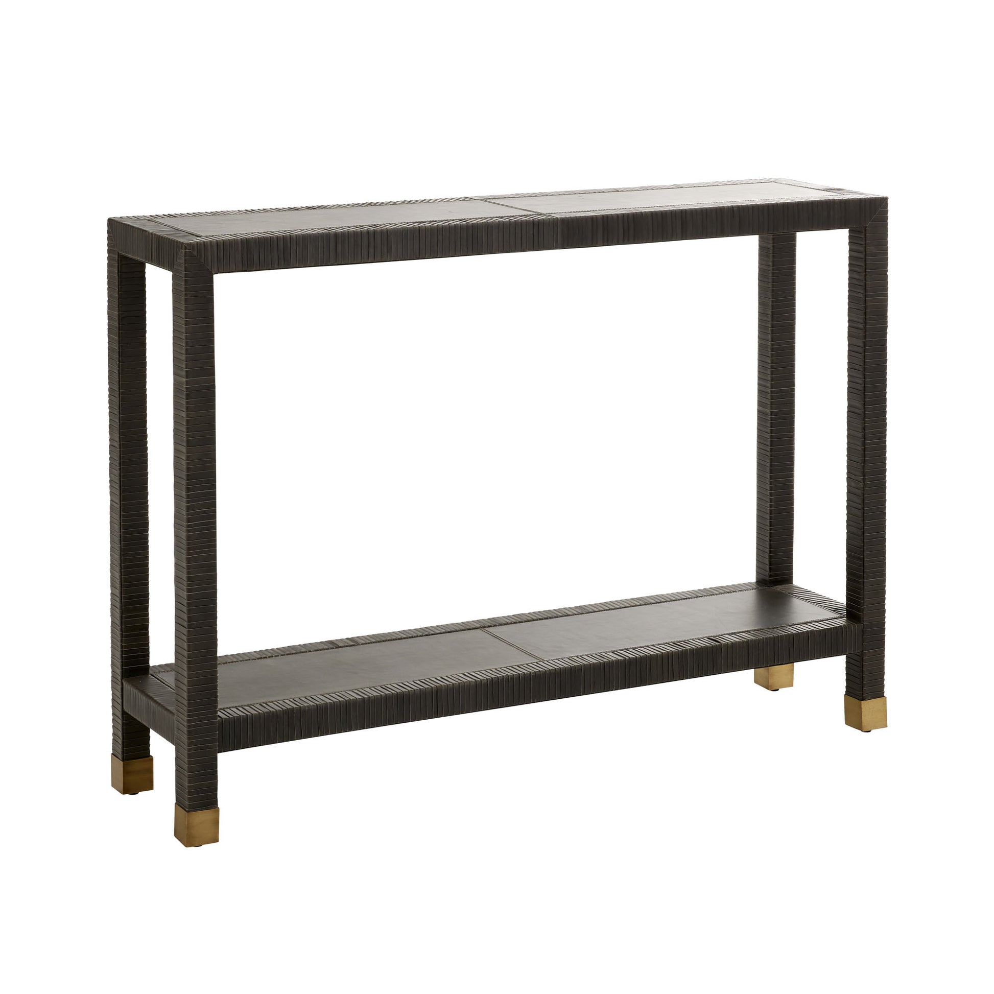 THE GRAPHITE LEATHER COMPOSITION FEATURES PANELS WRAPPED ALONG THE EDGES OF THE FRAME AND ANTIQUE BRASS-CAPPED LEGS.