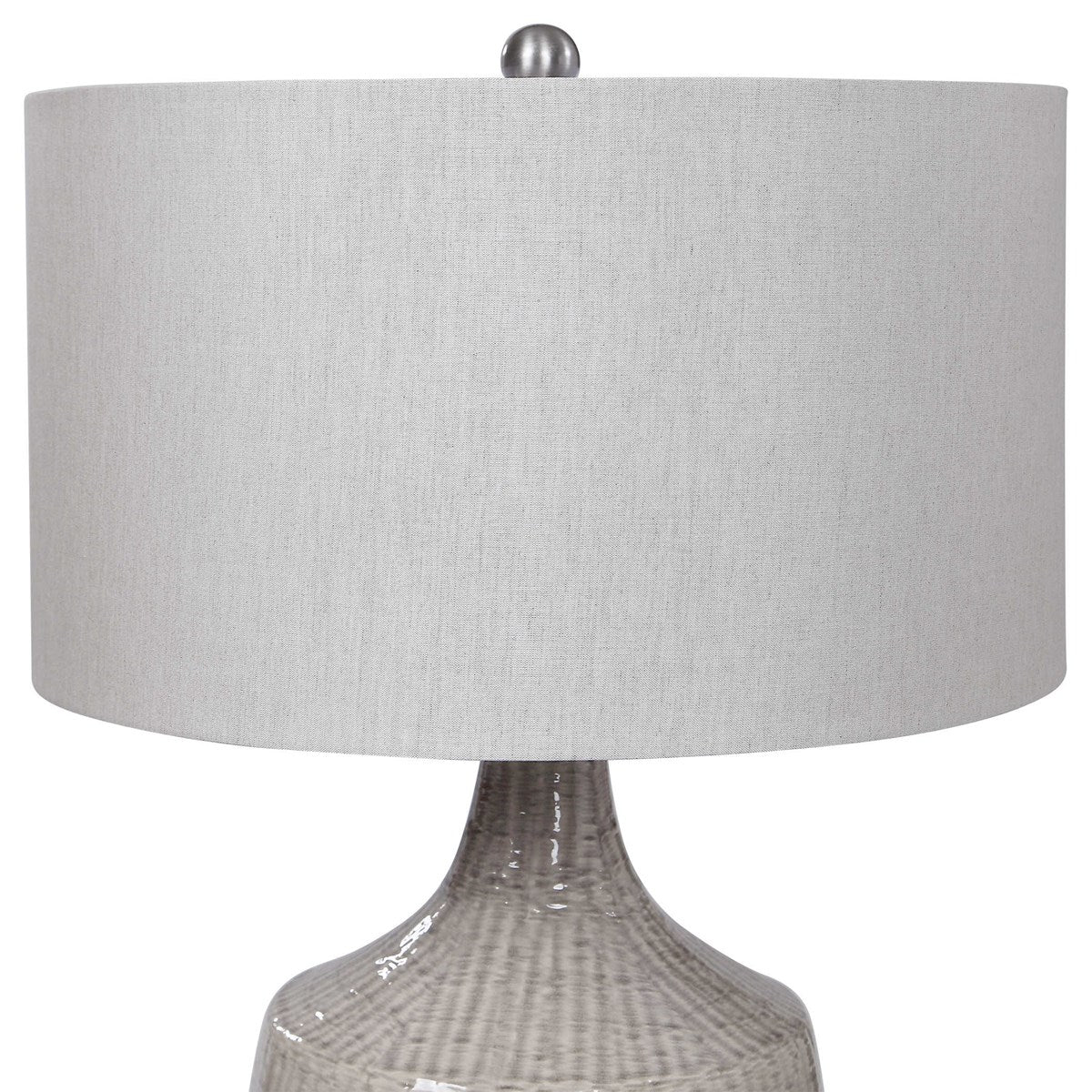 Upscale fashionable pattern that's finished in a distressed light gray glaze, paired with brushed nickel plated accents. This ceramic base keeps it smart in shape with a hardback drum shade in light gray linen fabric.