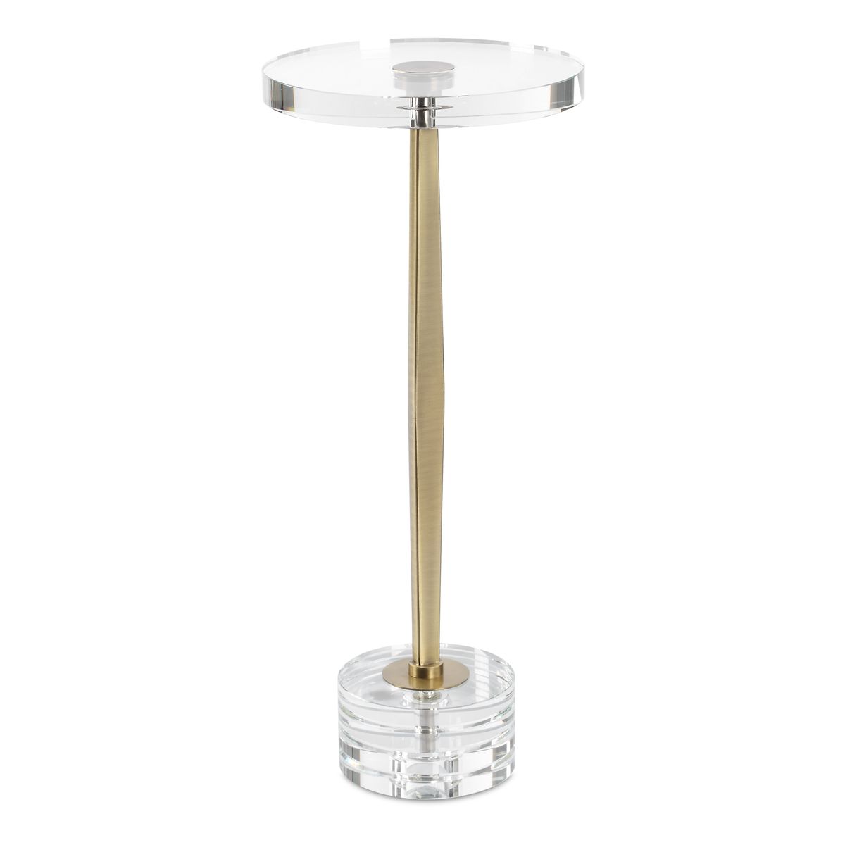 The Groove drink table features a sophisticated ribbed crystal base with a coordinating thick crystal top. The iron stem is finished in a classic brushed gold.