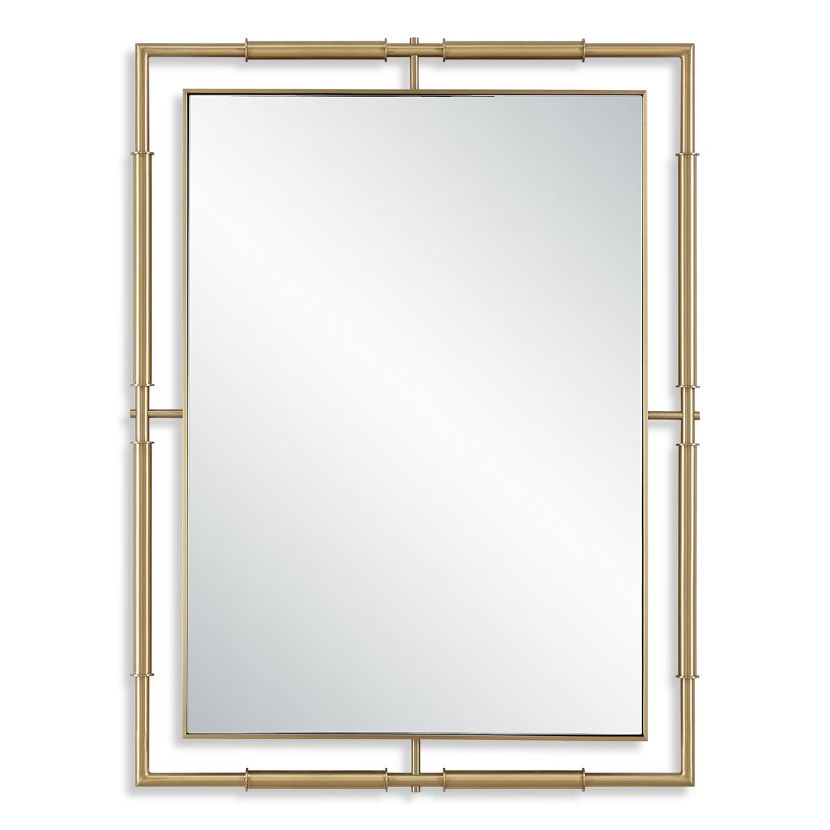 This rectangle stainless-steel frame is finished in a rich plated brass with a suspended outer frame that creates a soft, modern industrial vibe, all surrounding a floating polished edge mirror. May be hung horizontal or vertical.
