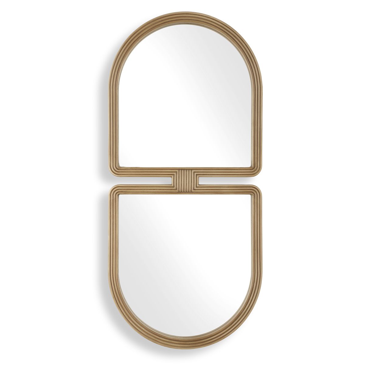 A modern twist on art deco design, this mirror breaks away from traditional shapes with its eye-catching silhouette. It features a sleek, wooden frame with grooved out channels finished in a light natural wood tone. The contrasting forms create a visually dynamic piece that complements both classic and contemporary interiors.