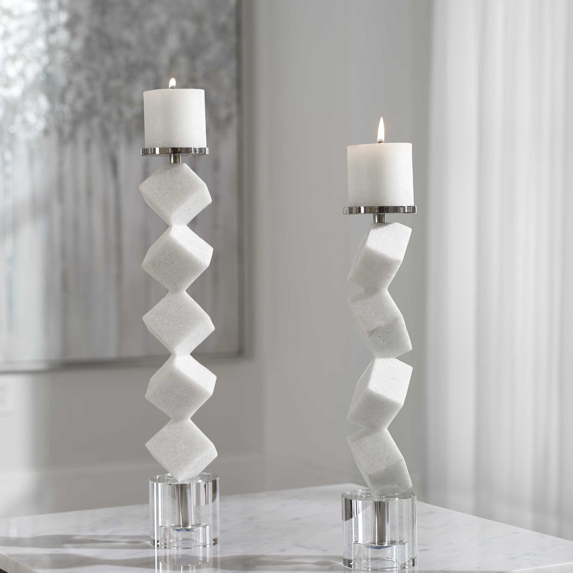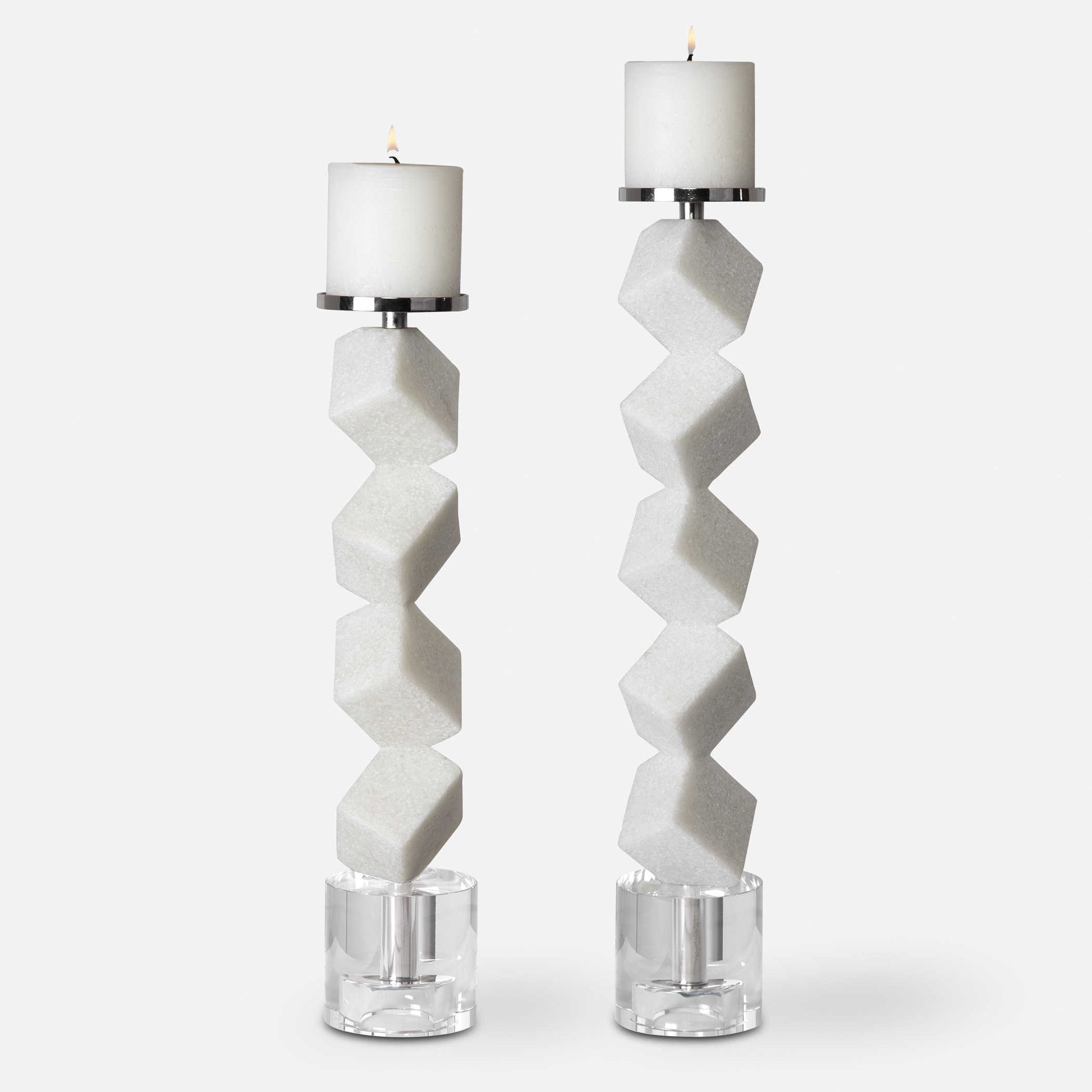 Set of two candleholders feature stacked cubes are crafted from ivory man-made stone that accurately replicates the look of Thassos marble set atop crystal bases with polished nickel candle cups. Two, 3x3 distressed white candles included. Sizes: S- 3x16x3, L-3x19x3.