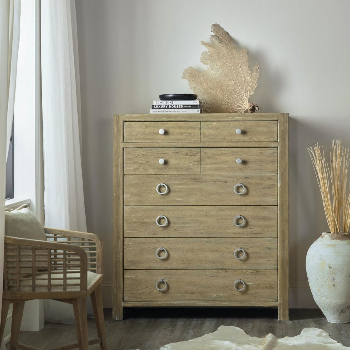 Featuring 6 self-closing drawers, the top drawer has a removable felt liner, and the bottom drawers have a cedar-lined bottom. Accented by antique nickel ring and knob pulls. Melding the salty, yet cozy oasis of the California coastline with a modern surf culture, this line is defined by the use of natural materials including rattan, jute rope, stone, gypsum, bamboo and driftwood motifs. Designed to create relaxing spaces to escape from the pressures of modern life, it is featured in a light, natural Driftwood finish. Luxurious materials, shapes and textures combine to create a relaxed, yet sophisticated style that epitomize the lifestyle of a casual, beach-town community.
