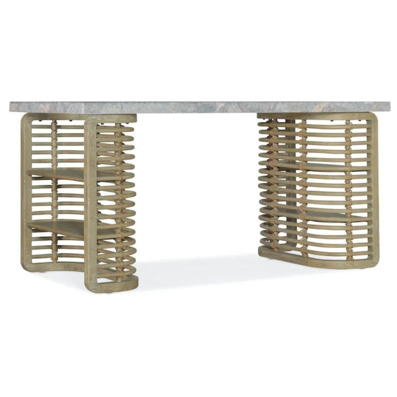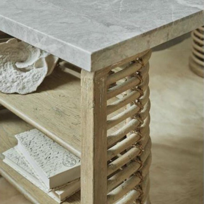 A marvel of craftsmanship and an artistic blend of natural materials, the SMalibu Writing Desk is crafted of Pecan Veneers in the light natural Driftwood with accents in rope and cane and a stone veneer top. There are 2 fixed shelves on each end. Melding the salty, yet cozy oasis of the California coastline with a modern surf culture, Surfrider is defined by the use of natural materials including rattan, jute rope, stone, gypsum, bamboo and driftwood motifs. Designed to create relaxing spaces to escape from the pressures of modern life, it is featured in a light, natural Driftwood finish. Luxurious materials, shapes and textures combine to create a relaxed, yet sophisticated style that epitomize the lifestyle of a casual, beach-town community.