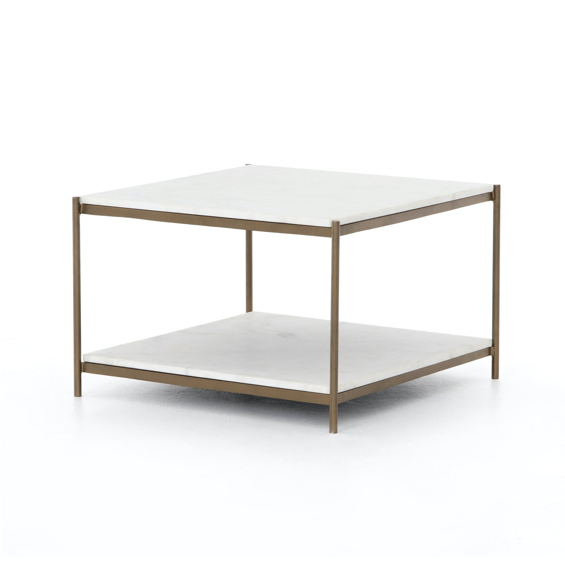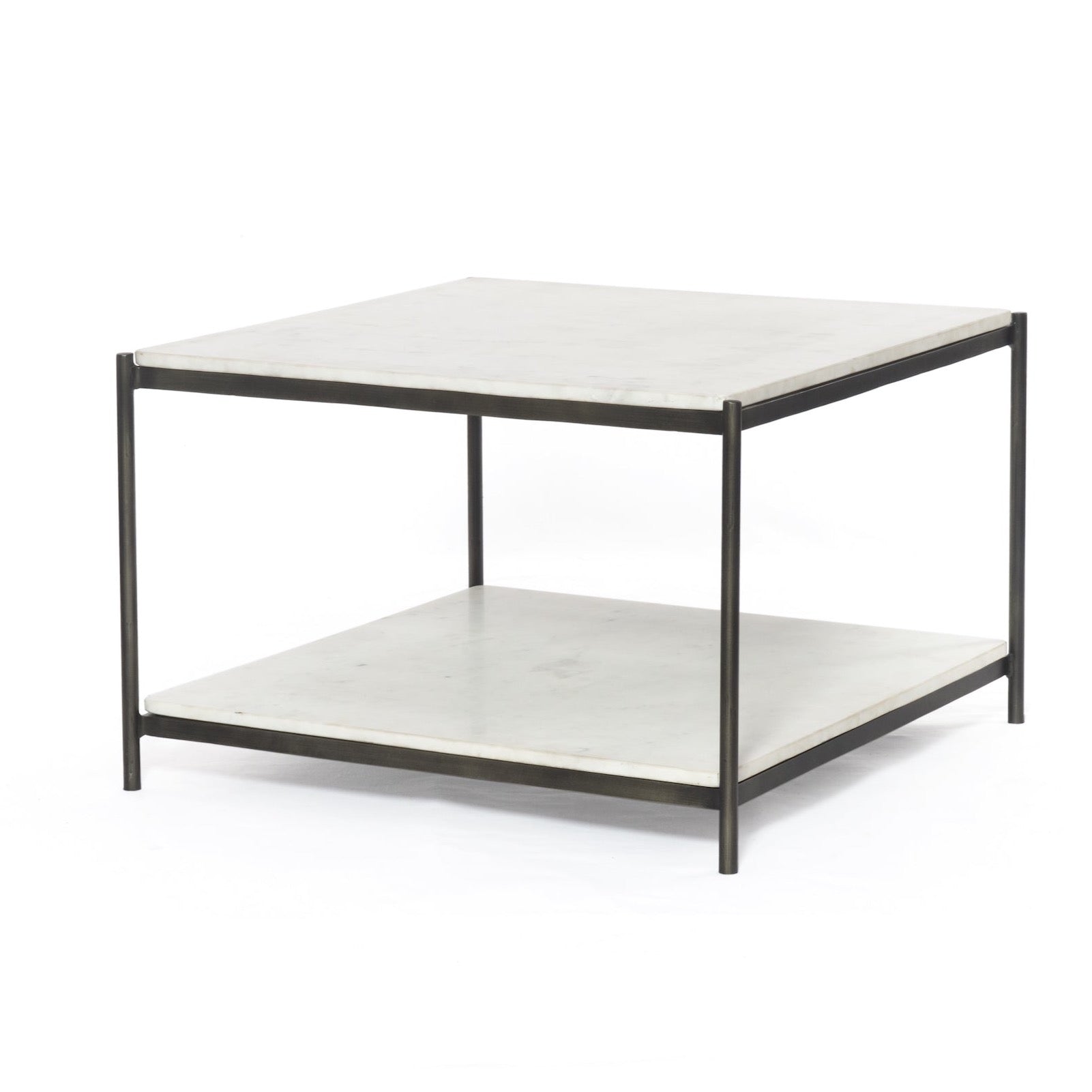 Classic white marble lays two tiers of smooth shelving for plenty of surface area. Hammered grey or Antique brass frame and casters for bedside storage or living room.