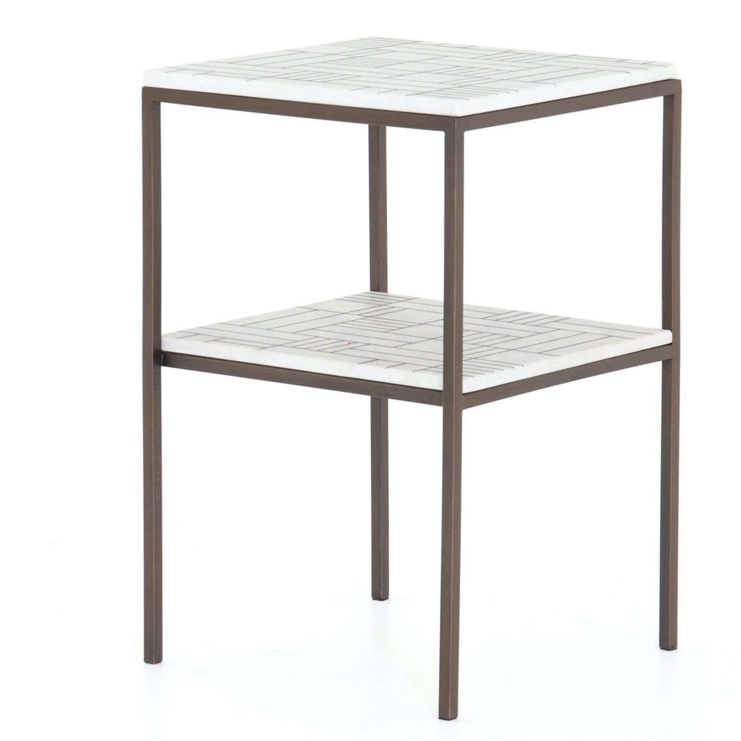 Combines bronze-finished steel (or antiqued brass) with white marble that's been screen-printed with a Mondrian-inspired pattern in bronze. Marble veining may vary, reflecting the authenticity of materials. Great in pairs.