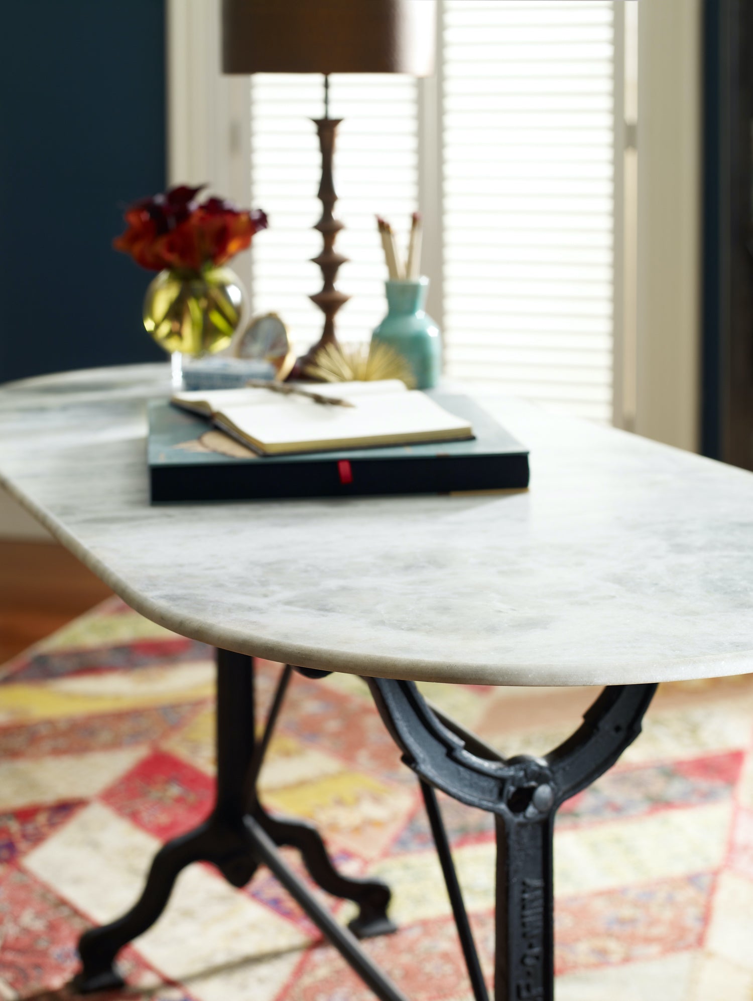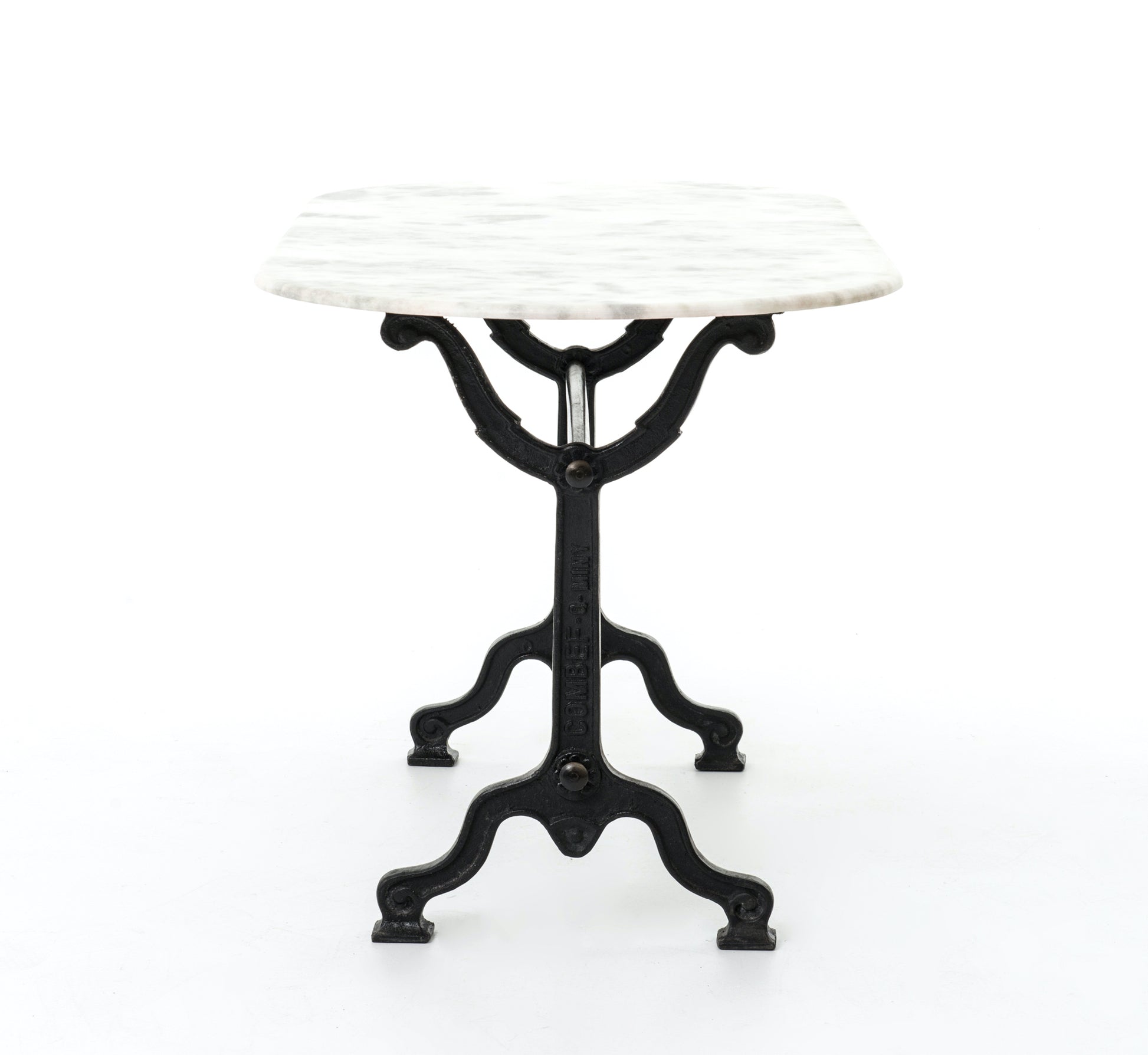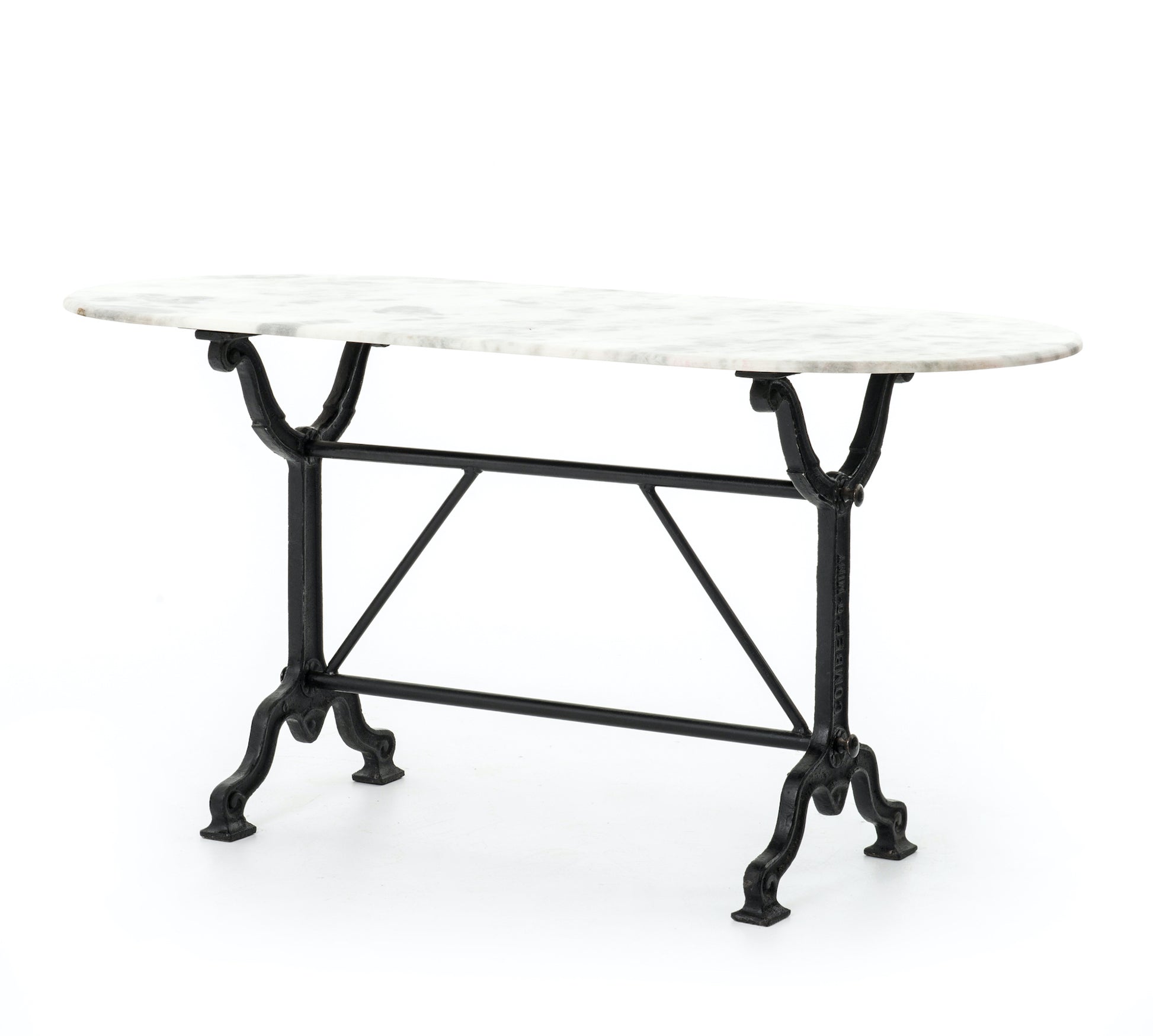 Marble and cast iron are transformed into something more delicate, with rounded shaping and a playful base that takes inspiration from a classic French industrial dining table. Nice for a writing desk.
