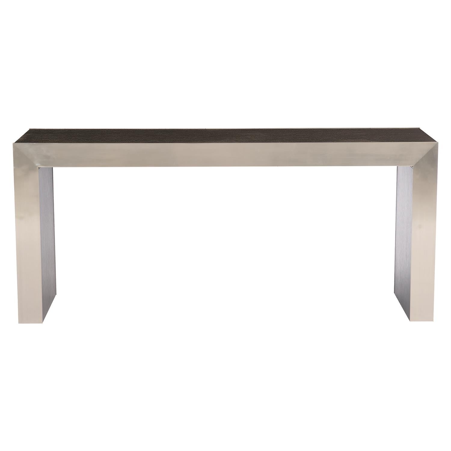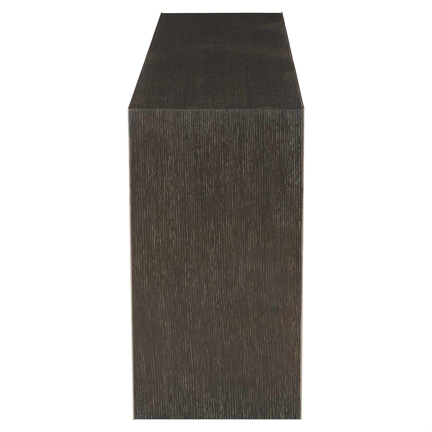 White oak veneers feature a dramatic yet casual Cerused Mink finish, while stainless steel faceplates in a Silver Mist finish provide a sleek contrast to the textured wood. The streamlined, architectural form conveys a modern sense of style. Contrasting materials and finishes offer a hint of glamour, though the design remains subtle and sophisticated.
