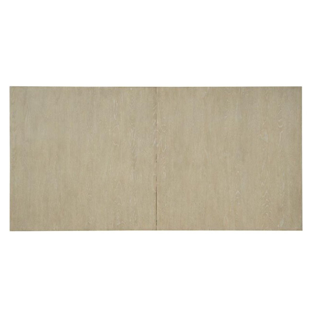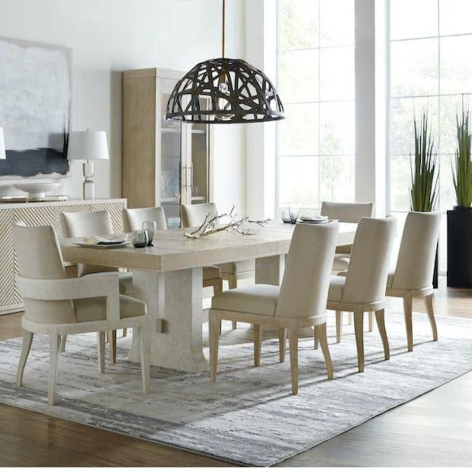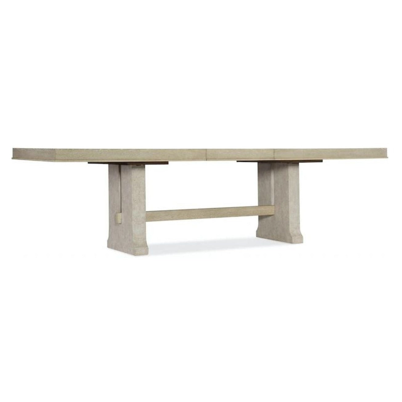 This modern farmhouse style table is crafted of Oak Veneers that features a stretcher that joins the 2-pedestal base, with the entire base finished in a creamy-colored textured gesso with crackle. The tabletop is a soft taupe finish on oak veneers with dry brushing. With one 22-inch leaf, the table extends to 106 inches long, accommodating 2 arm chairs and 6 side chairs.
