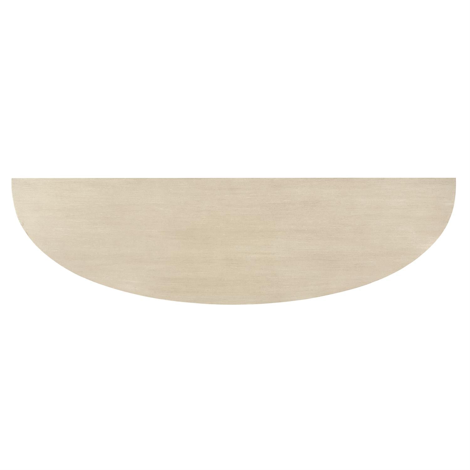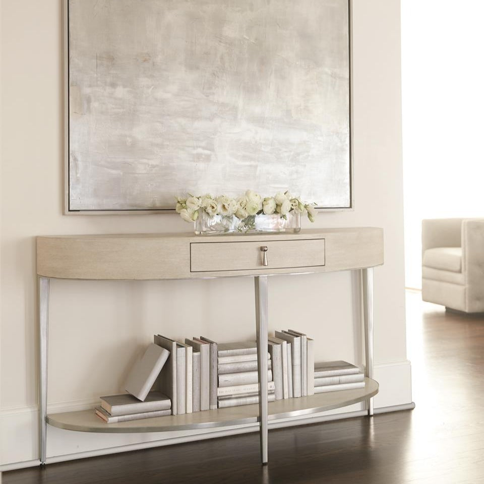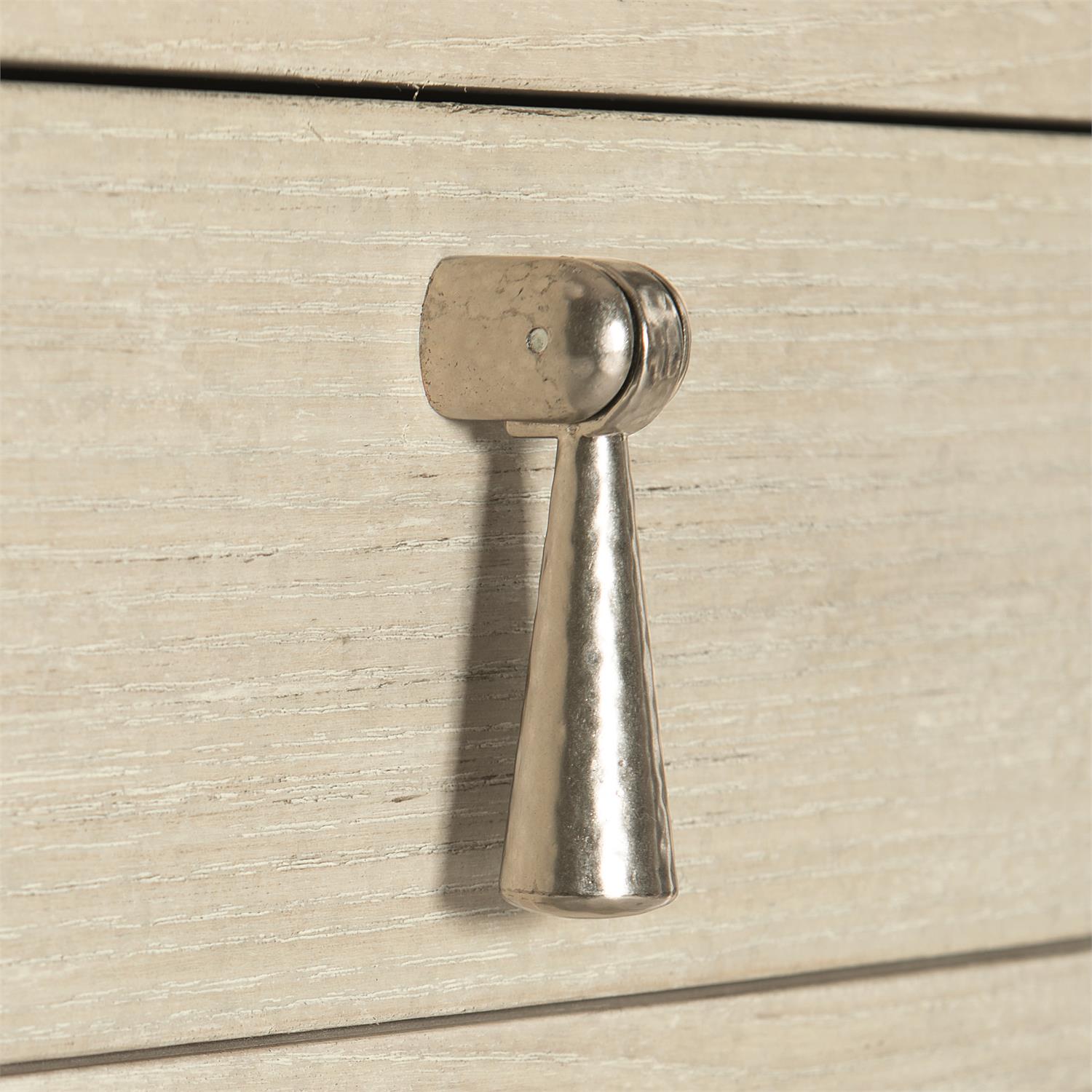Quartered ash veneers feature a Cerused Linen finish, created using light wire brushing and cerusing techniques to highlight the linear wood grain. Adding a hint of shine, a stainless steel base with slender tapered legs is finished in a lustrous Aged Silver. A bottom shelf offers additional space for display and storage.