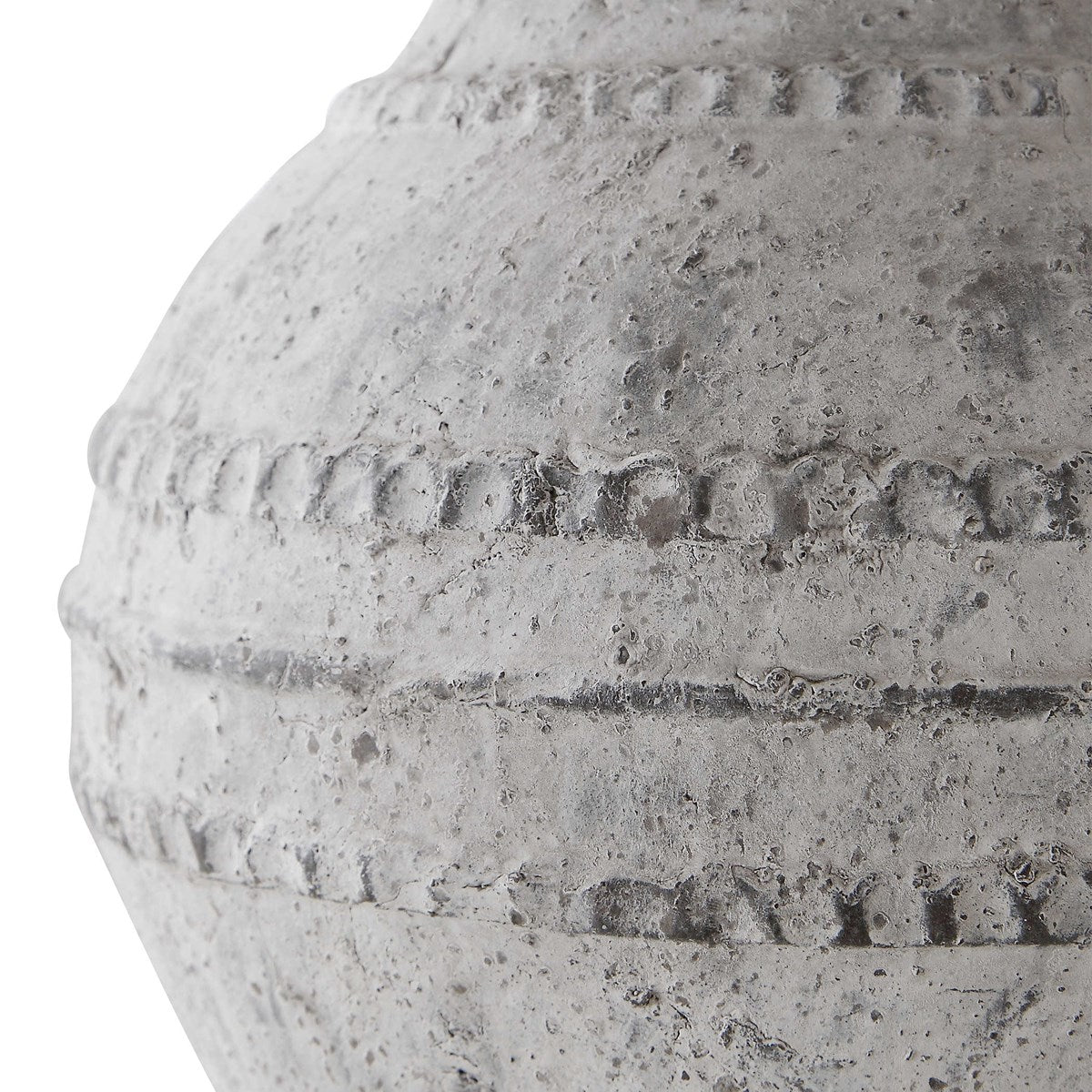 This table lamp has a heavily distressed ceramic stone ivory finish with aged gray undertones. The table lamp is accented with brushed nickel plated details. An off-white linen fabric is on the hardback drum shade